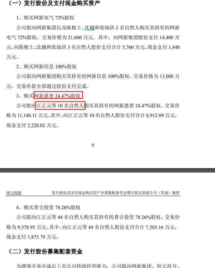 其中在网新恩普方面,浙大网新拟向江正元等10名自然人购买其持有的网新恩普24.47%股权,交易价格为11,140.11万元。其中,向江正元等10名自然人股份支付合计8,912.09万元,现金支付2,228.02万元。