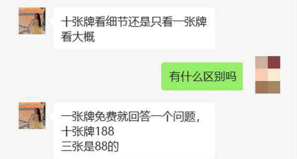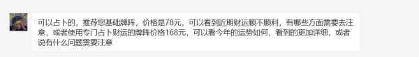 调查人员在暗访中也体验了这种新形式的网红算命。相关主播在线下的回复显示,可以看财运顺不顺利,牌阵价格越高,看得越仔细。