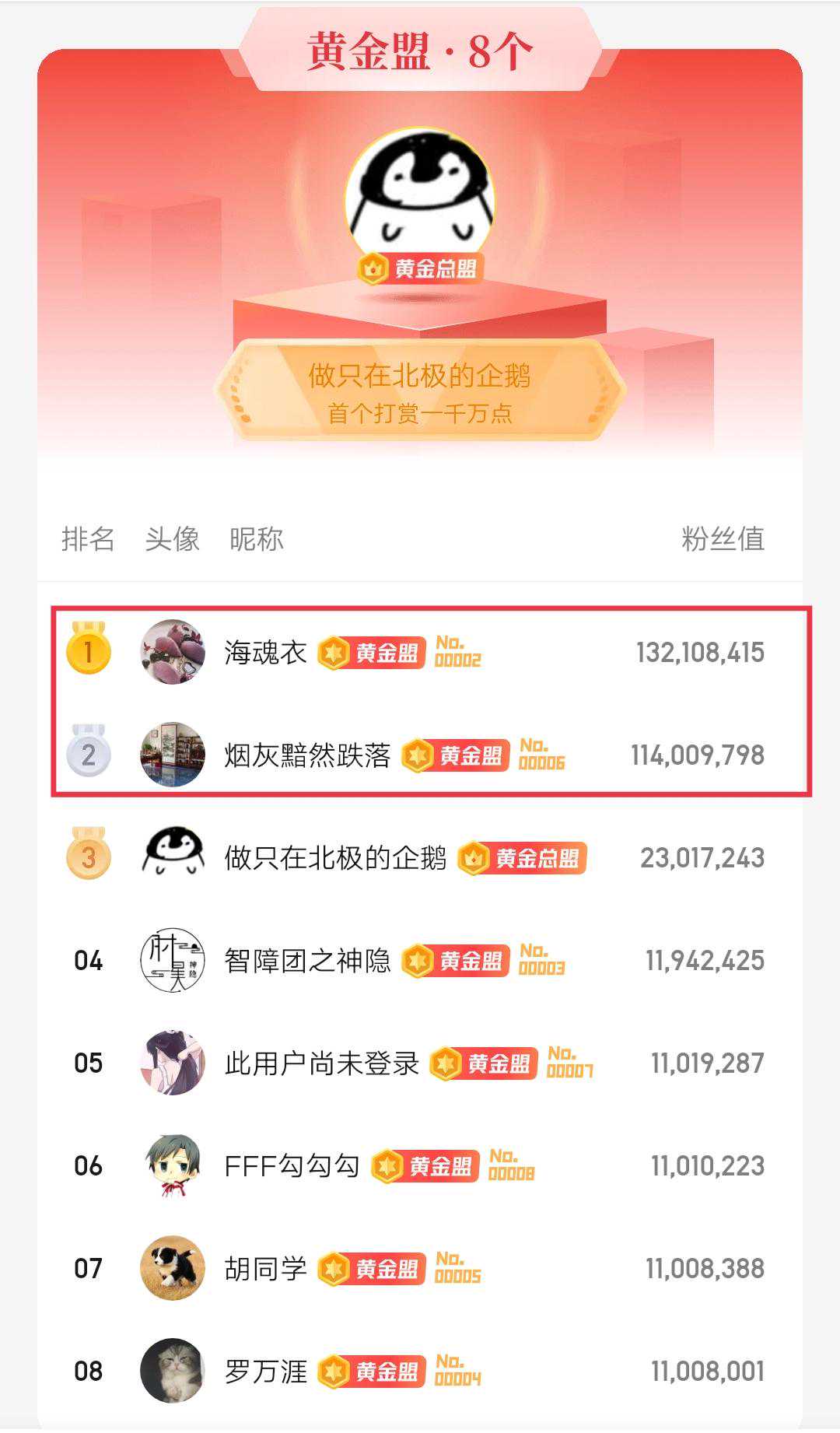随后就是一连串的黄金盟打赏了,而这期间海魂衣也追加了三个黄金盟,只是未能抵挡大佬攻势,最终宅猪又重新夺回了第一,双方又回到之前的位置了。