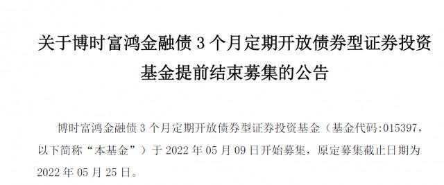 除同业存单基金提前结募,还有部分固收类基金产品同样如此。5月25日,博时基金公告,因基金发售期内,广大投资者认购踊跃,博时富鸿金融债3个月定期开放债券基金提前结束募集。该基金的基金成立公告显示,该基金最终的募集有效认购总户数为298户,募集期间净认购金额约68.26亿元。