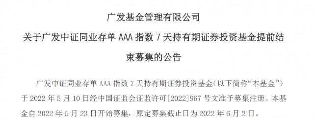 具体来看,5月27日,广发基金发布公告,广发中证同业存单AAA指数7天持有期基金提前结束募集,并对5月26日的有效认购申请采用“末日比例确认”的原则给予部分确认。最终,该基金5月26日有效认购申请确认比例结果为91.461039%。