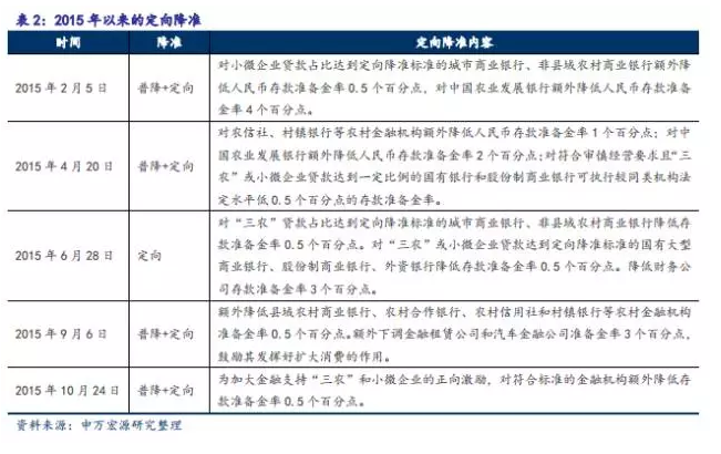差别准备金动态调整,是指根据不同银行的资本充足率、资产质量状况等指标,以及是否超出合意贷款规模等标准,采取不同的存款准备金率。差额准备金动态调整通过对银行进行差别化的管理,将贷款总量调控和个体风险结合起来,兼顾了金融机构的系统重要性、经营稳健性等因素。此外,2015年以来央行多次对符合审慎经营要求并且对三农、小微企业贷款规模达到一定标准的银行进行了定向降准或额外降准,这赋予了差别准备金制度更广泛的内涵,具有了引导信贷投放结构的功能。
