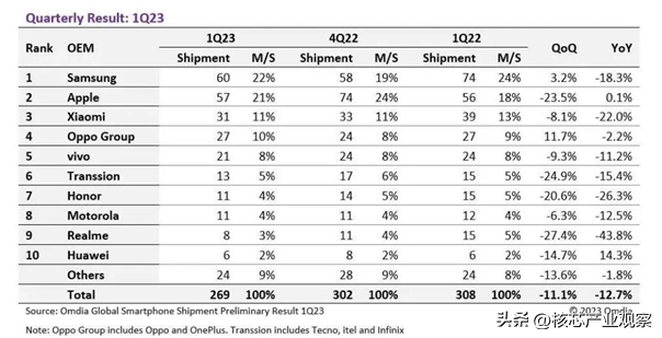智能手机市场高增长的时代早已过去,在近两年的数据来看手机市场已经开始呈现较大幅度的下滑。根据omdia发布的2023年第一季度全球智能手机市场统计报告,2023年第一季度全球手机出货量达到2.69亿部,同比去年同期出货量下滑12.7%,比上一季度出货量下滑11.1%。