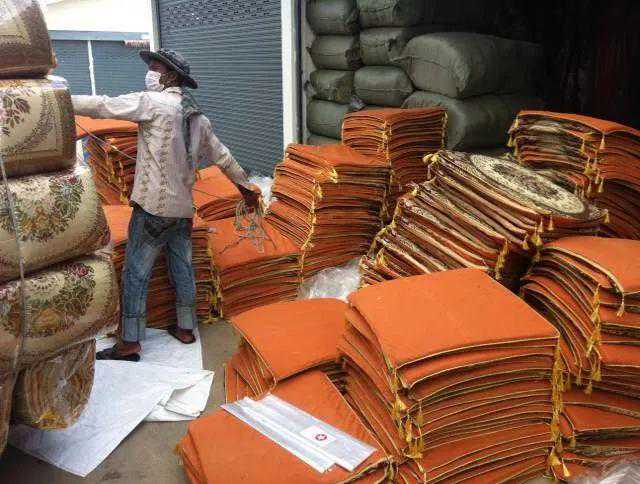 这个,无神论者金老板早些年是不知道的。直到,他承包了全泰国的佛垫。每个月,有两大货柜总计二十万条佛垫,从他位于杭州余杭运河镇的工厂发出,迢迢千里,到达泰国最大的口岸。很快,这些制作精良的佛垫,就会出现在泰国大小寺庙,数以万计虔诚信徒的膝下,与不息的香火构成佛国一道独特的风景。