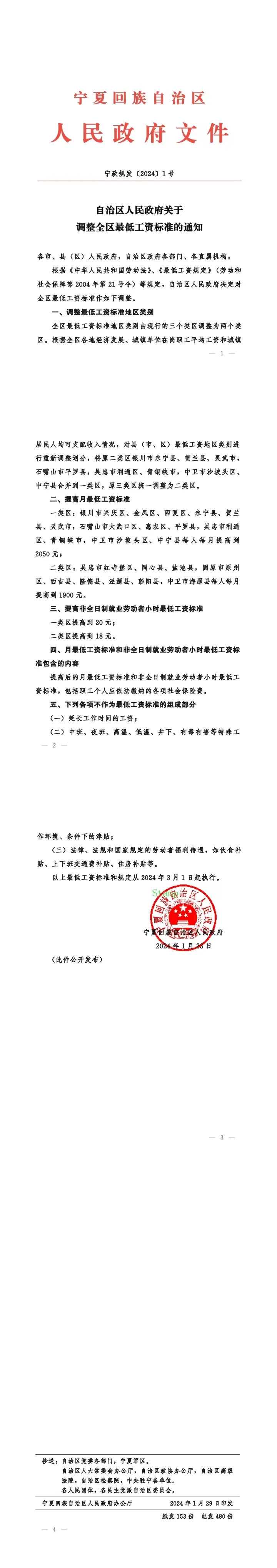 1月29日,宁夏回族自治区人民政府印发《关于调整全区最低工资标准的通知》,自2024年3月1日起执行。