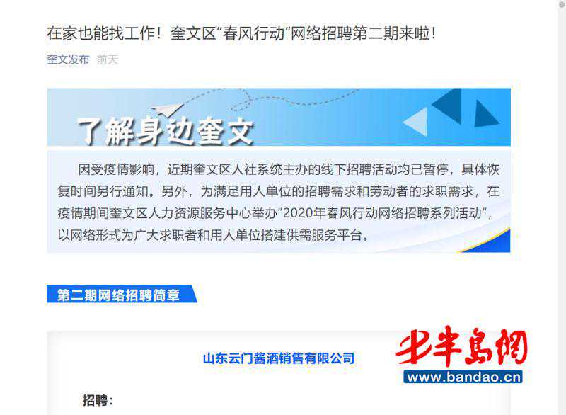 奎文区人社局组织举办“就业服务不打烊、网上招聘不停歇”春风行动系列线上招聘活动,通过电话、微信平台、创业园区宣传等方式广泛收集用工信息,在山东公共招聘网、“奎文发布”和“奎文区人力资源服务中心”公众号、社区居民群等发布招聘简章3期,组织天佑德建设咨询有限公司、潍坊瑞亨缘运输有限公司等86家企业提就业岗位2226个,涉及教育、环保、文化传媒、商贸流通、餐饮服务等20余个行业领域。