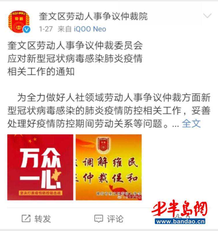 研究制定《奎文区劳动人事争议仲裁委员会应对新型冠状病毒感染肺炎疫情相关工作的通知》,对节前申请立案的16起劳动仲裁案件依法中止审理程序,做出仲裁案件延期审理决定44个并电话通知案件当事人,消除劳资双方因疫情防控不能及时到庭产生的顾虑,有利于企业专心复工投产,保障劳动关系和谐稳定。(通讯员刘文平张茜)