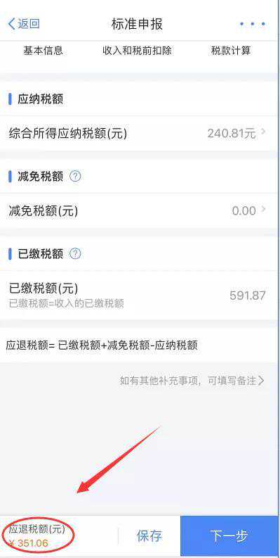 6.选择【开始申报】,界面会显示【应纳税额】、【减免税额】、【已缴税额】以及【应退税额】