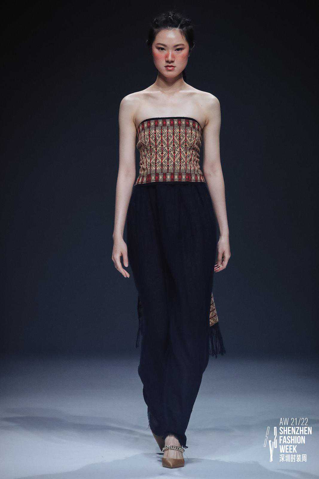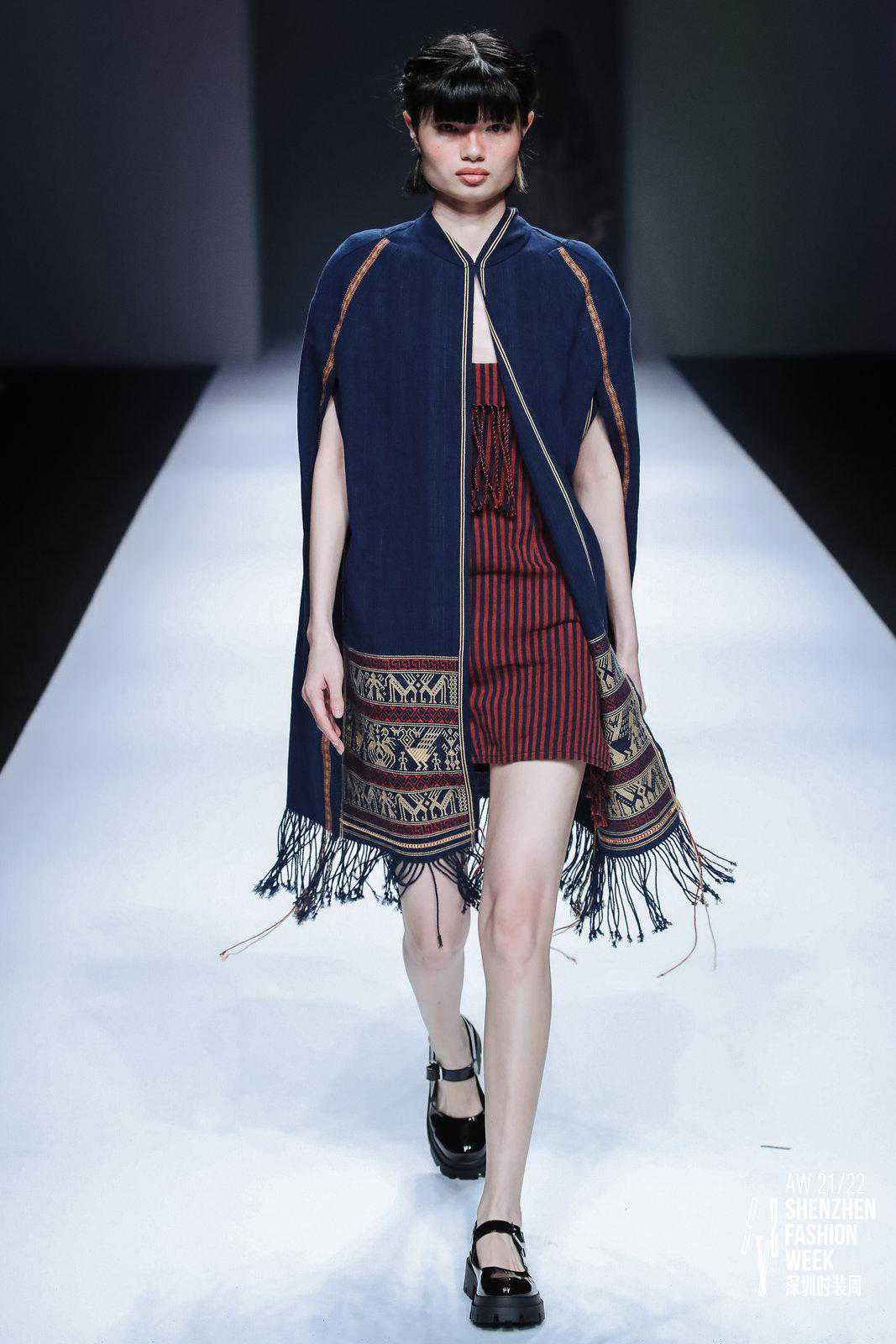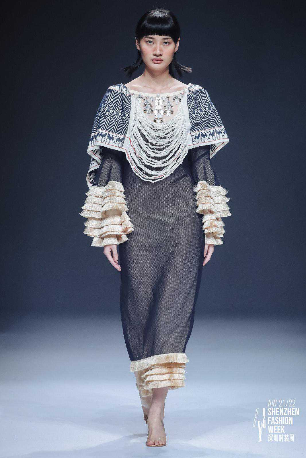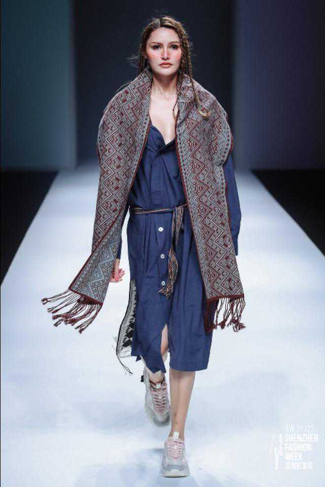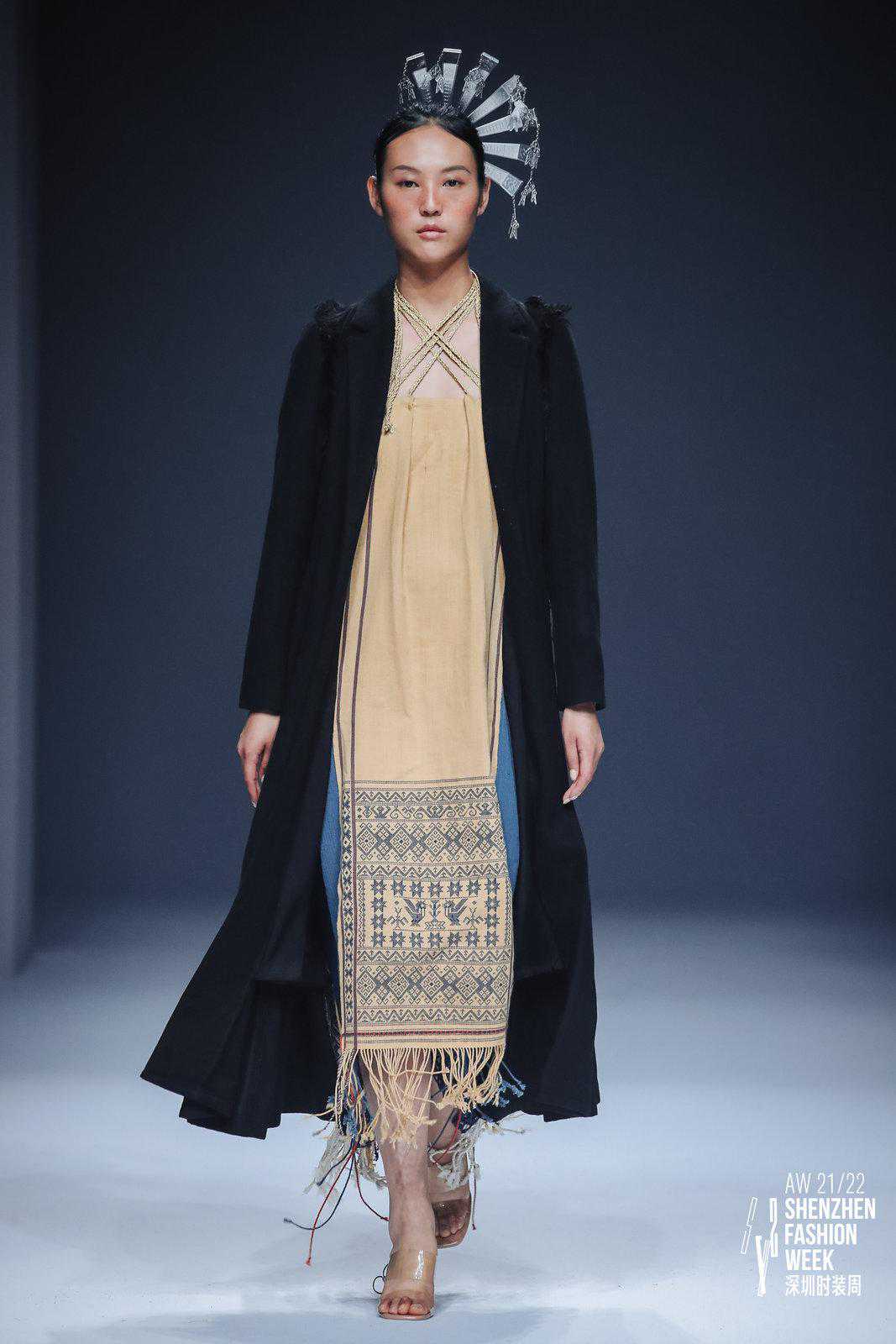 来自海南黎族的古老纺织品被青年设计师时尚化,红黄蓝配色深沉复古,使人联想到东方瓷器。黎锦+流苏的时尚表现力不容低估,伴随着模特台步而灵动摇曳,其韵味被展现得淋漓尽致。模特的妆发配饰也是亮点,粗糙的编发野性十足,不规则头巾、手镯、耳环搭配民族服饰,“锦”上添花。