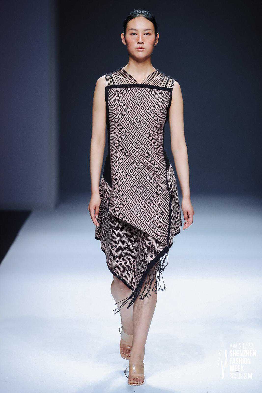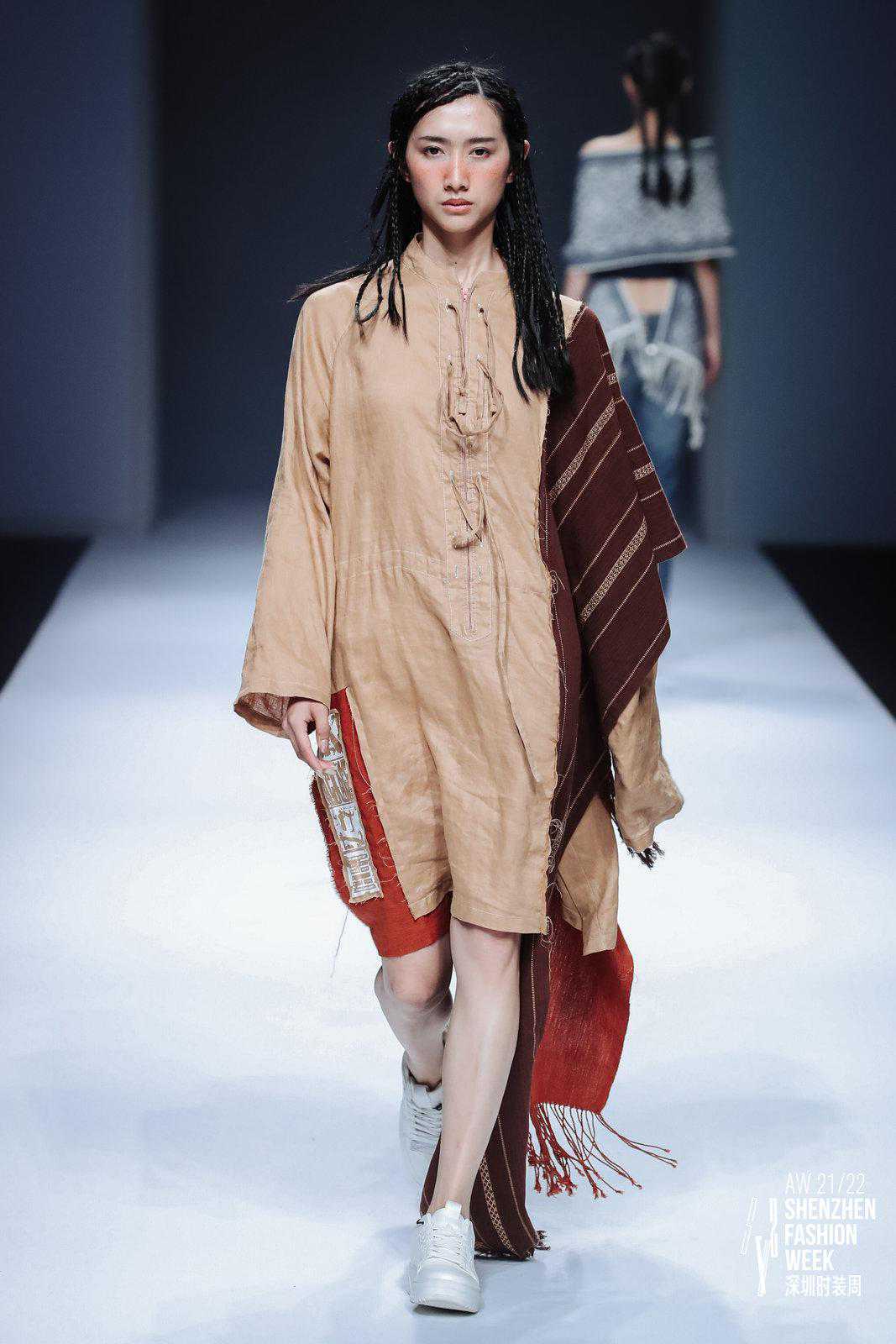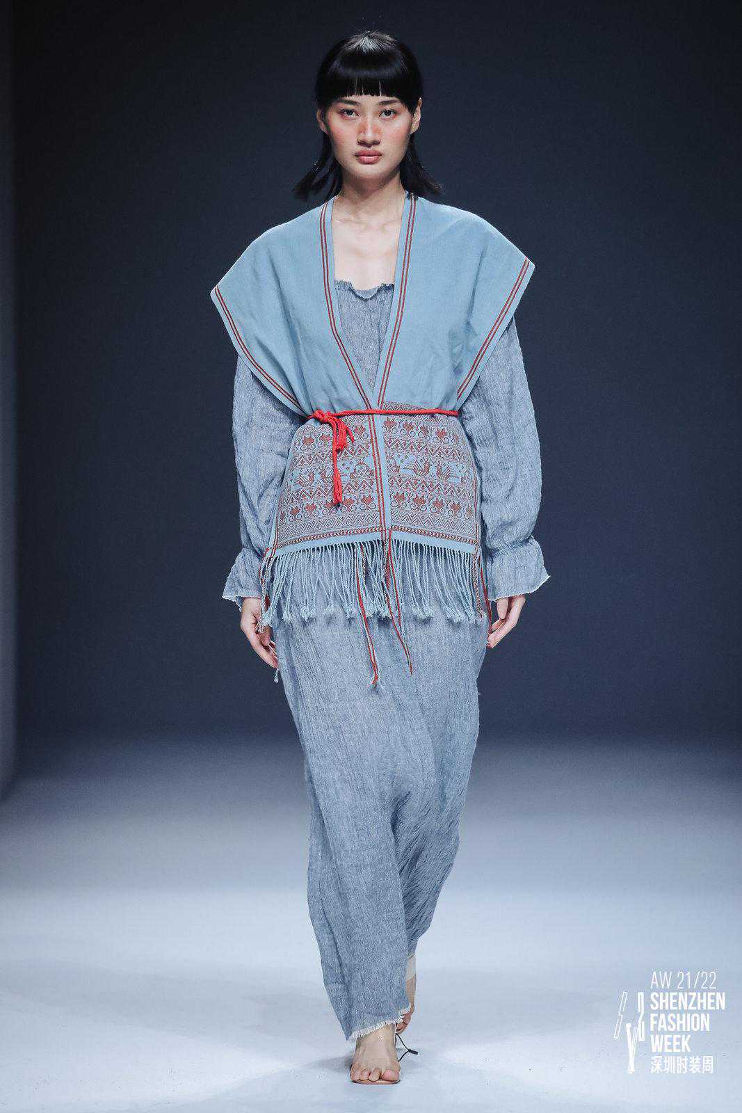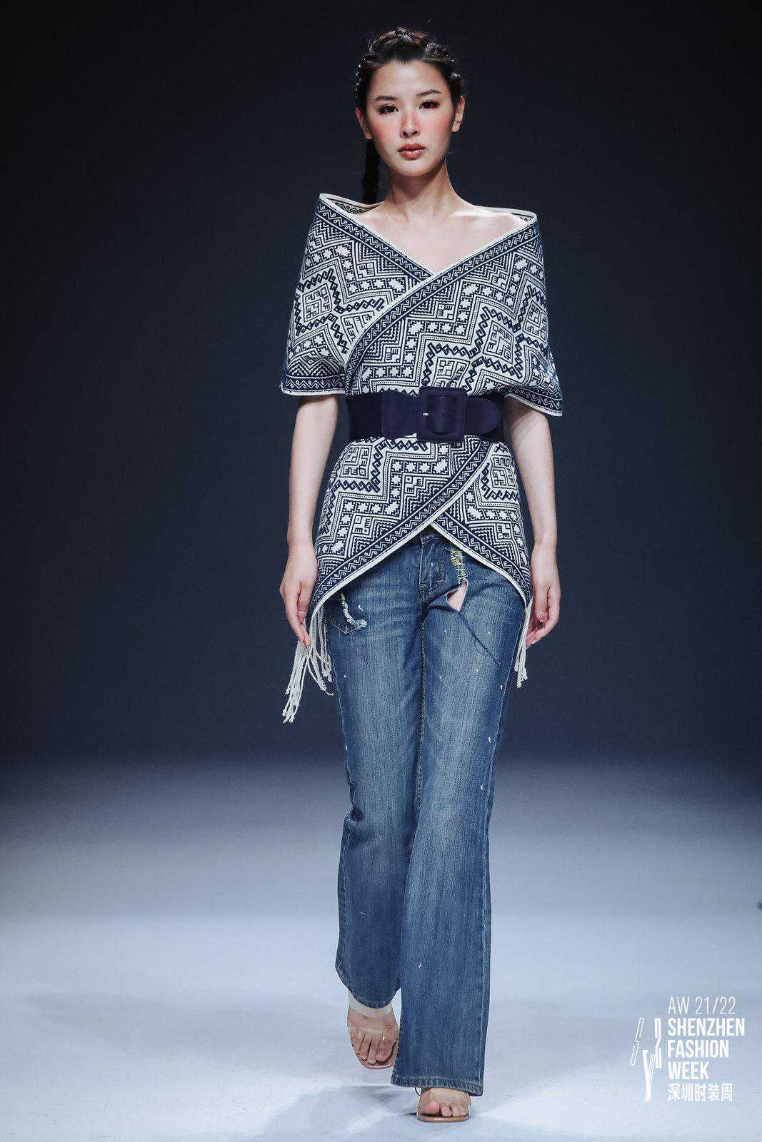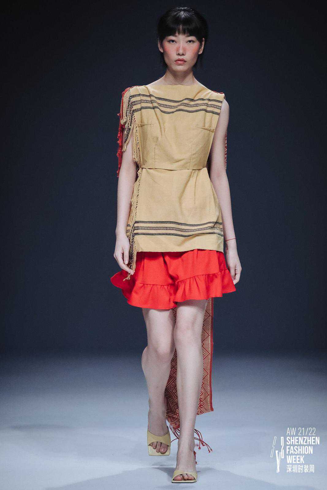 来自海南黎族的古老纺织品被青年设计师时尚化,红黄蓝配色深沉复古,使人联想到东方瓷器。黎锦+流苏的时尚表现力不容低估,伴随着模特台步而灵动摇曳,其韵味被展现得淋漓尽致。模特的妆发配饰也是亮点,粗糙的编发野性十足,不规则头巾、手镯、耳环搭配民族服饰,“锦”上添花。
