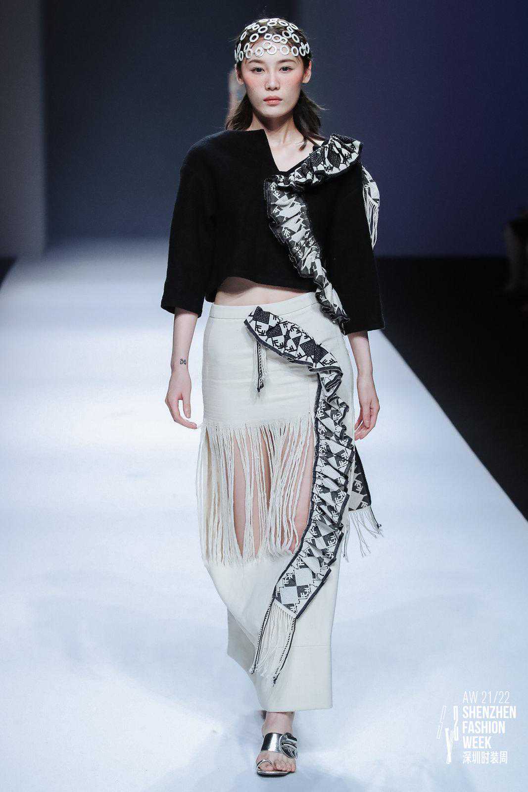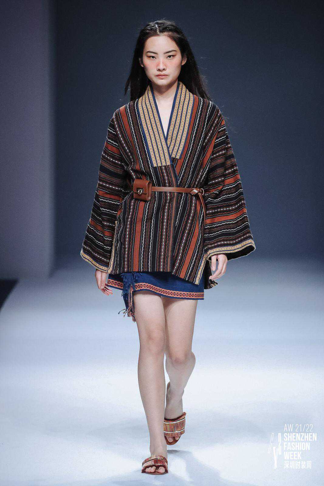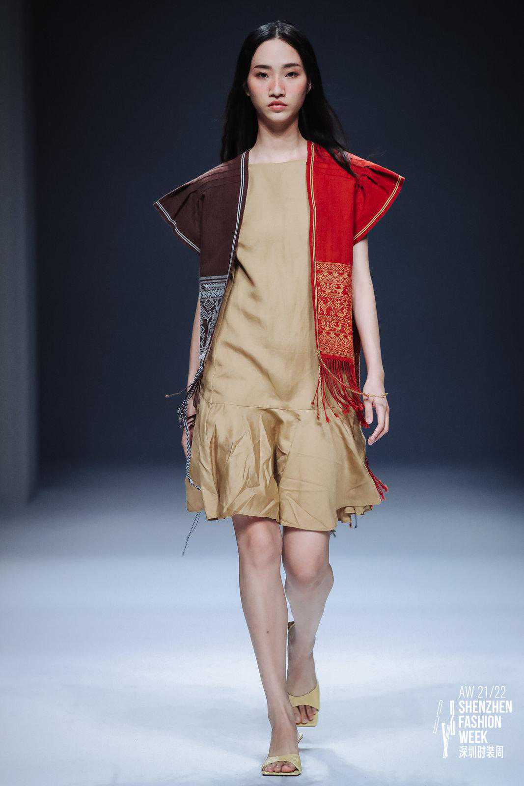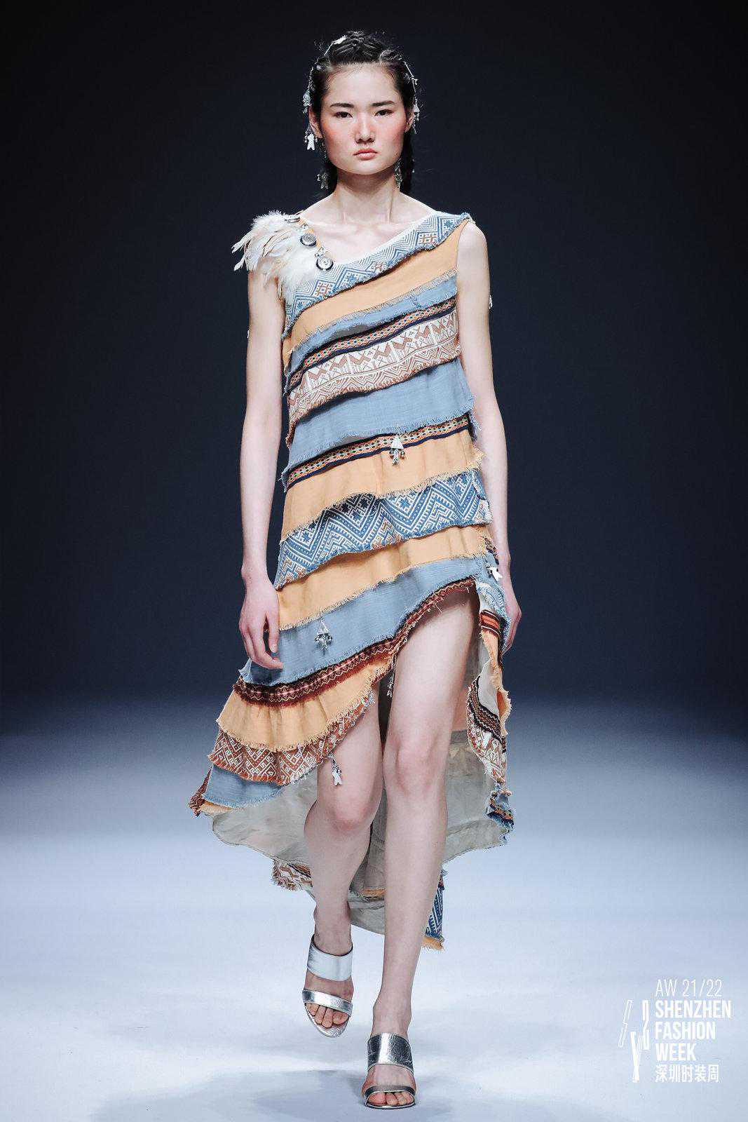 来自海南黎族的古老纺织品被青年设计师时尚化,红黄蓝配色深沉复古,使人联想到东方瓷器。黎锦+流苏的时尚表现力不容低估,伴随着模特台步而灵动摇曳,其韵味被展现得淋漓尽致。模特的妆发配饰也是亮点,粗糙的编发野性十足,不规则头巾、手镯、耳环搭配民族服饰,“锦”上添花。