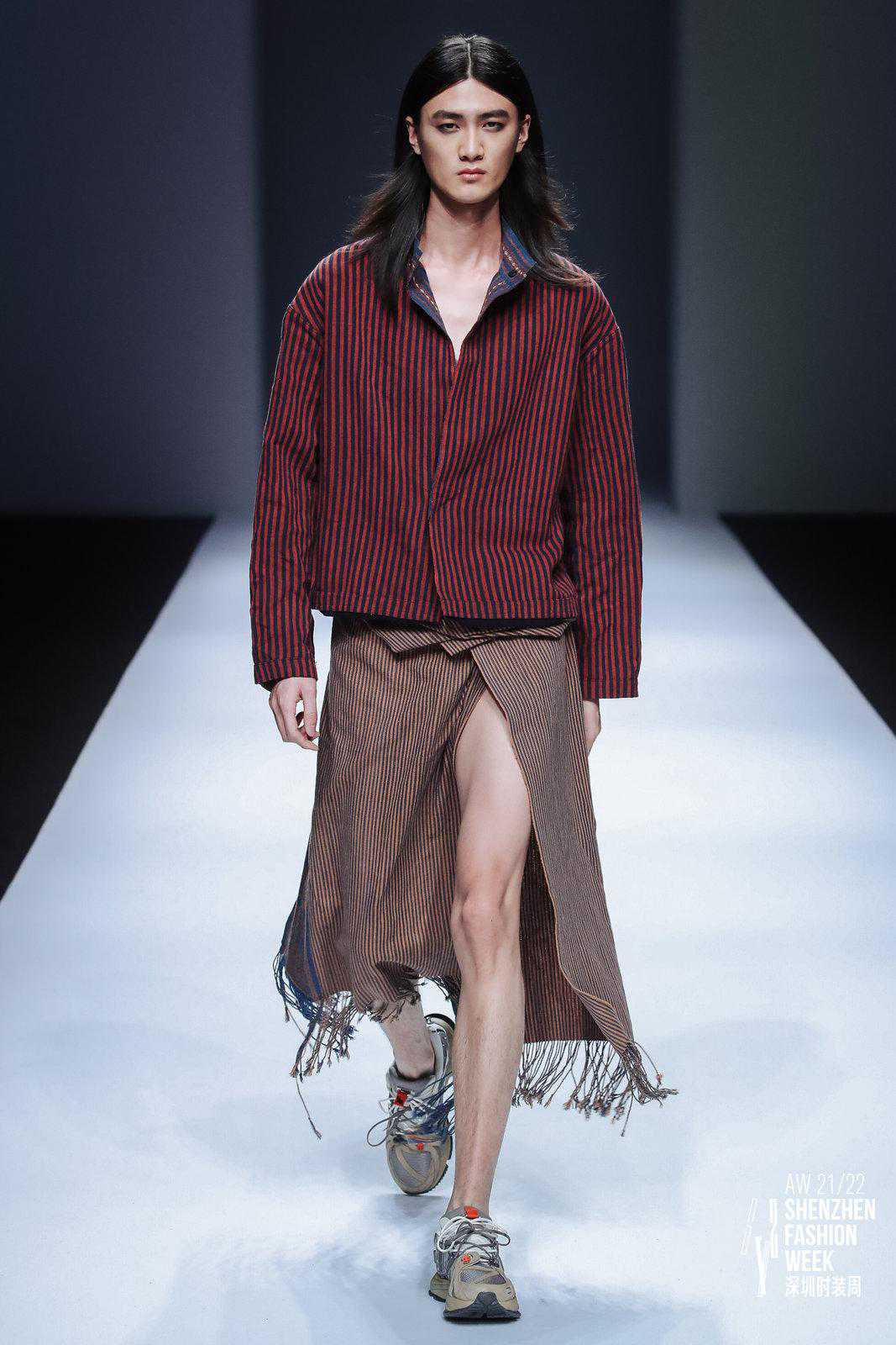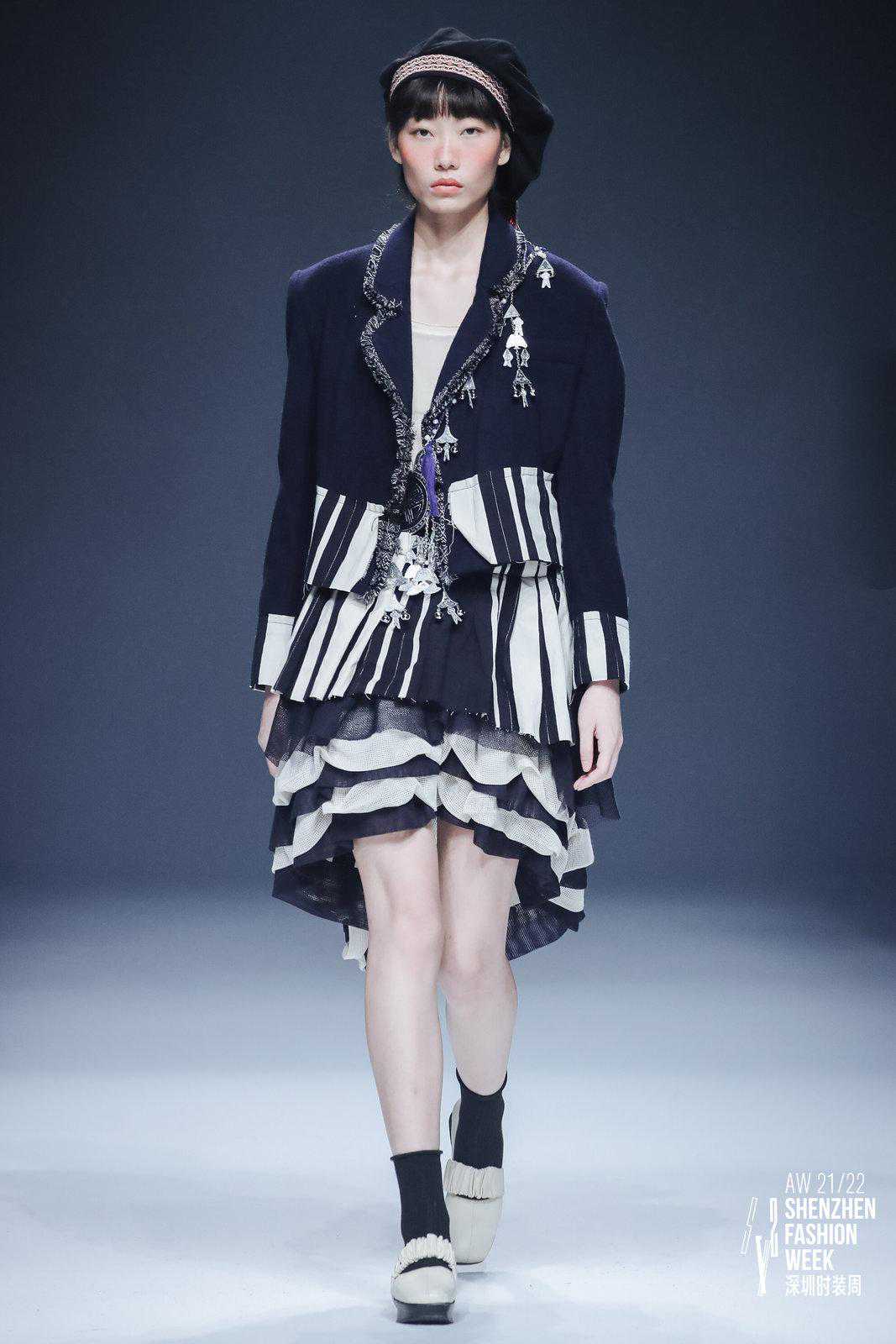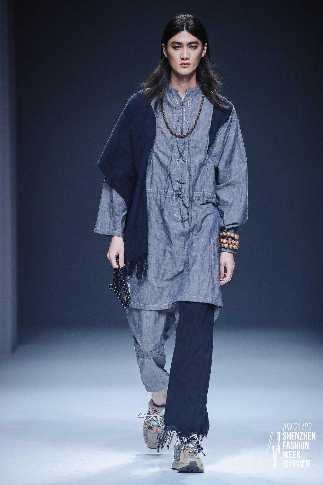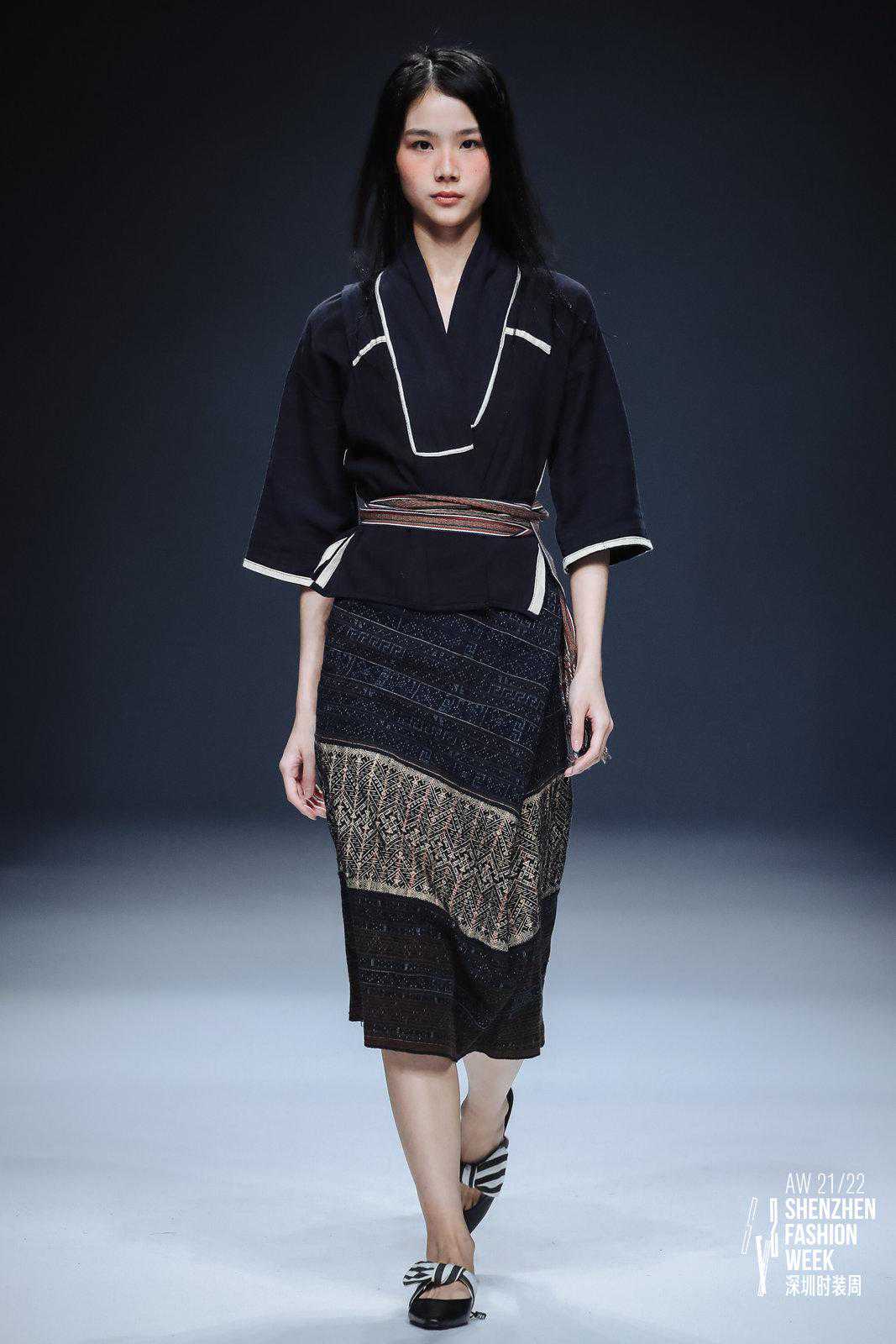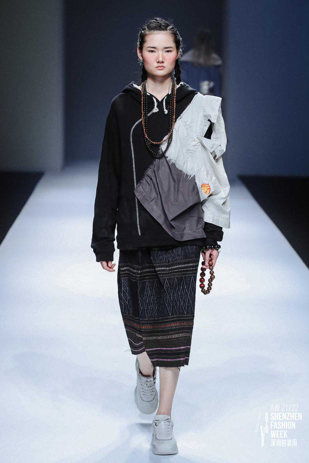 来自海南黎族的古老纺织品被青年设计师时尚化,红黄蓝配色深沉复古,使人联想到东方瓷器。黎锦+流苏的时尚表现力不容低估,伴随着模特台步而灵动摇曳,其韵味被展现得淋漓尽致。模特的妆发配饰也是亮点,粗糙的编发野性十足,不规则头巾、手镯、耳环搭配民族服饰,“锦”上添花。