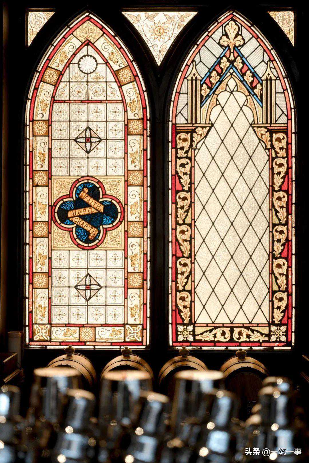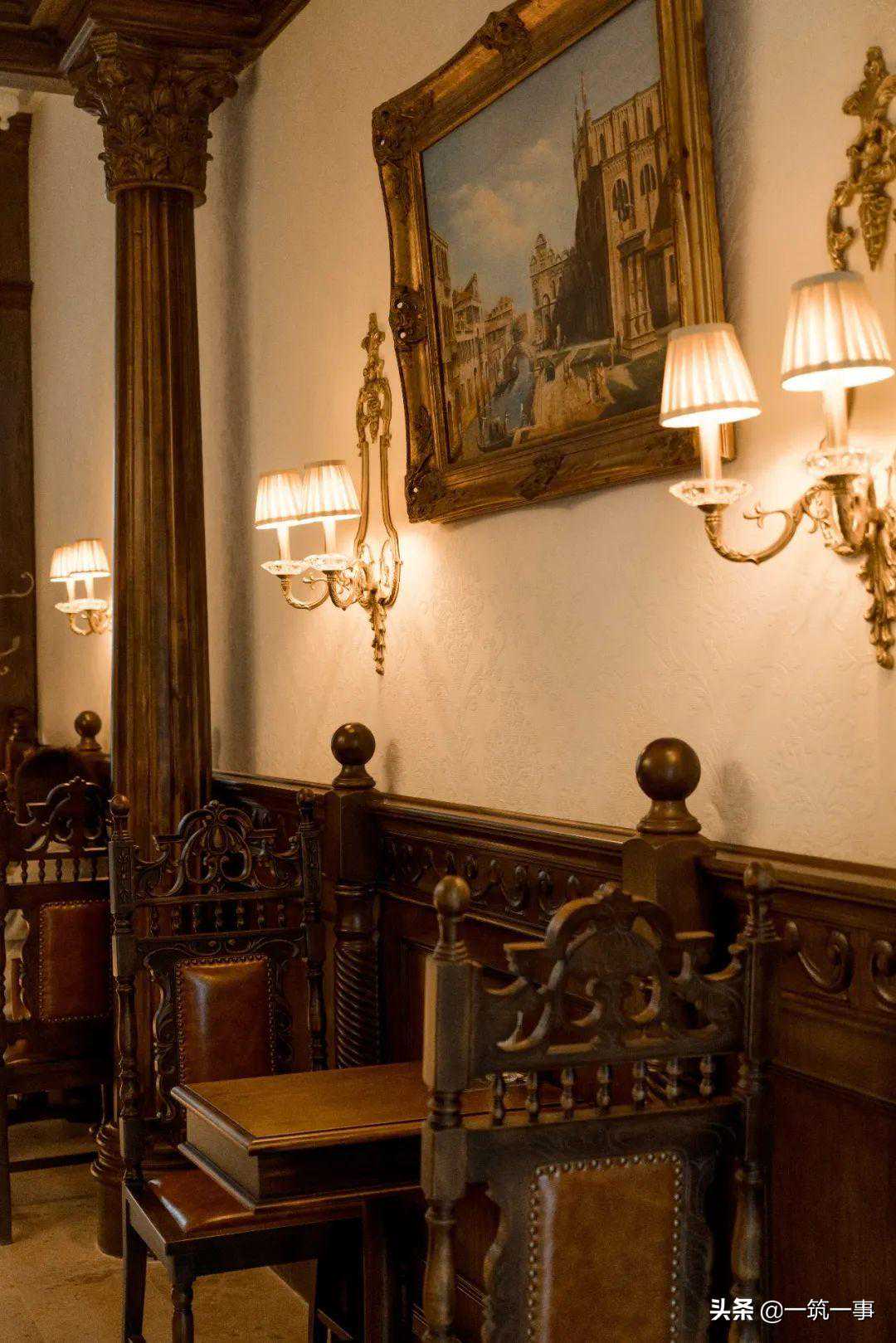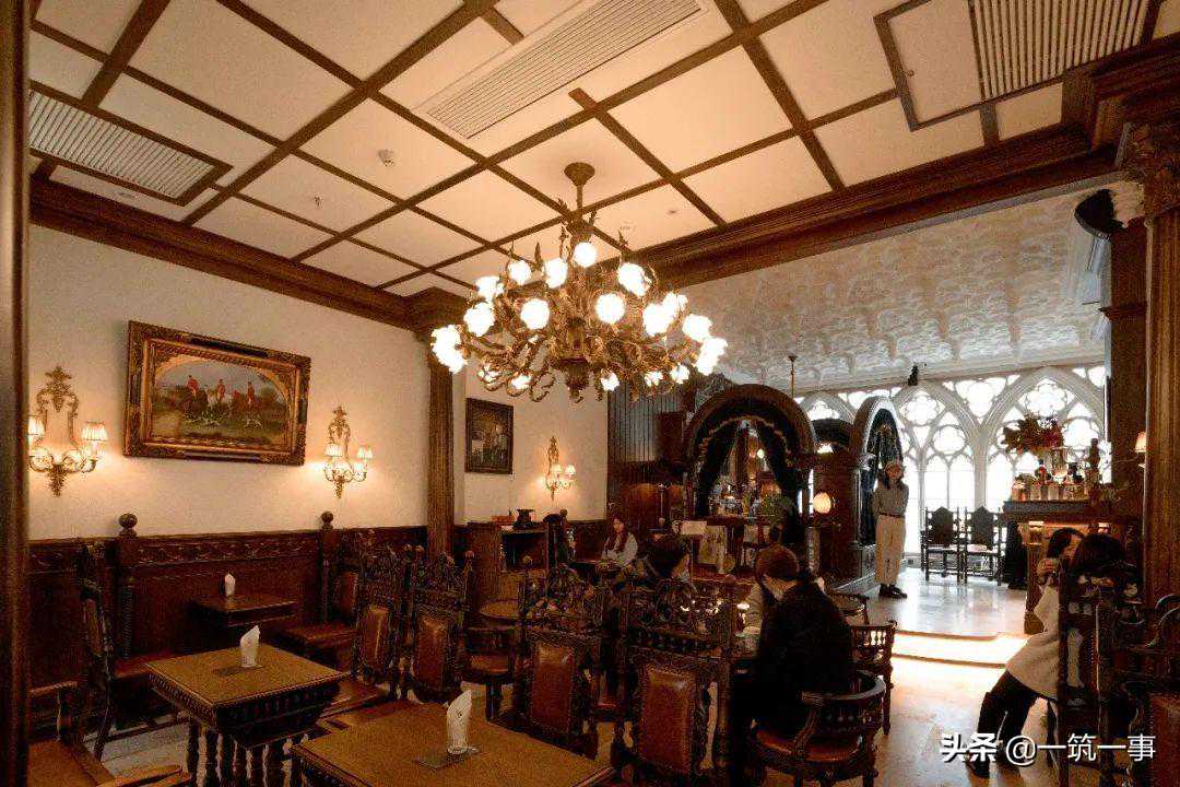 进入空间深处,仿佛回到了18世纪的欧洲,洛可可风格吊灯和壁灯、新古典主义艺术风格的油画、奢华又精美的巨大吊顶、哥特风格的彩绘玻璃和落地窗每一处都展示着设计者的审美趣味和用心程度。