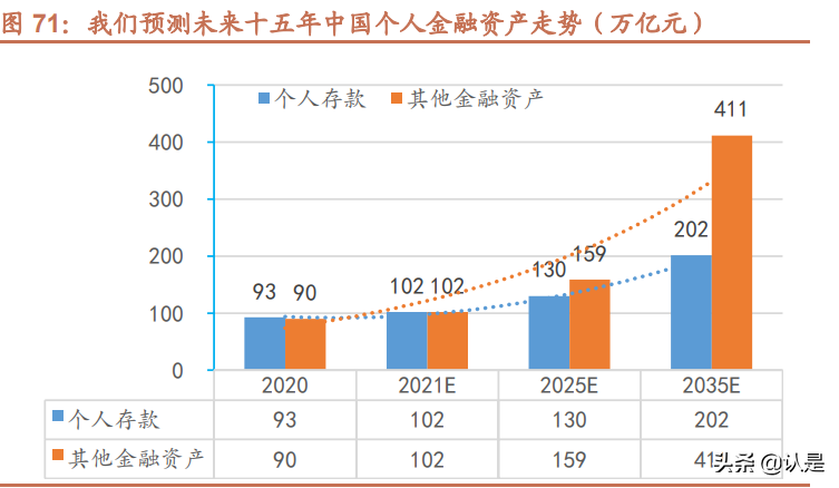 财富管理是成长性赛道,发展空间巨大。未来15年,中国个人财富快速增长,并将呈现两大趋势:1)个人财富中房地产占比下降,金融资产占比上升;2)个人金融资产中个人存款占比显著下降,资管产品占比大幅提升。中国财富管理行业正在迎来大发展。当前,中国个人金融资产约200万亿元,个人存款100万元,占比近半。我们预计2035年,中国个人金融资产将超600万亿,其中,个人存款200万亿元,存款以外的金融资产将超400万亿元(近70万亿美元)。届时,中国资管产品总规模超过美国(目前42万亿美元),或成为财富管理全球第一大市场。