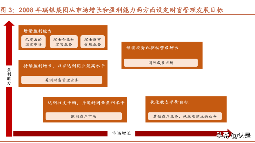 大力发展财富管理业务,积极拓展海外市场。自金融危机以来,瑞银集团一直坚持“以财富管理为核心”的发展战略,积极拓展海外市场。2008年,瑞银集团从盈利能力和市场增长两个方面设定财富管理业务发展路径,通过已覆盖的国际市场、瑞士的企业和个人业务以及瑞士本土财富管理业务增强盈利能力;在美国市场,大力发展财富管理业务,力争达到同业顶尖水平;在欧洲市场,通过在岸市场业务优化收支平衡目标,增强市场增长潜力;对于国际成长市场,将继续加大投资以推动营收增长。