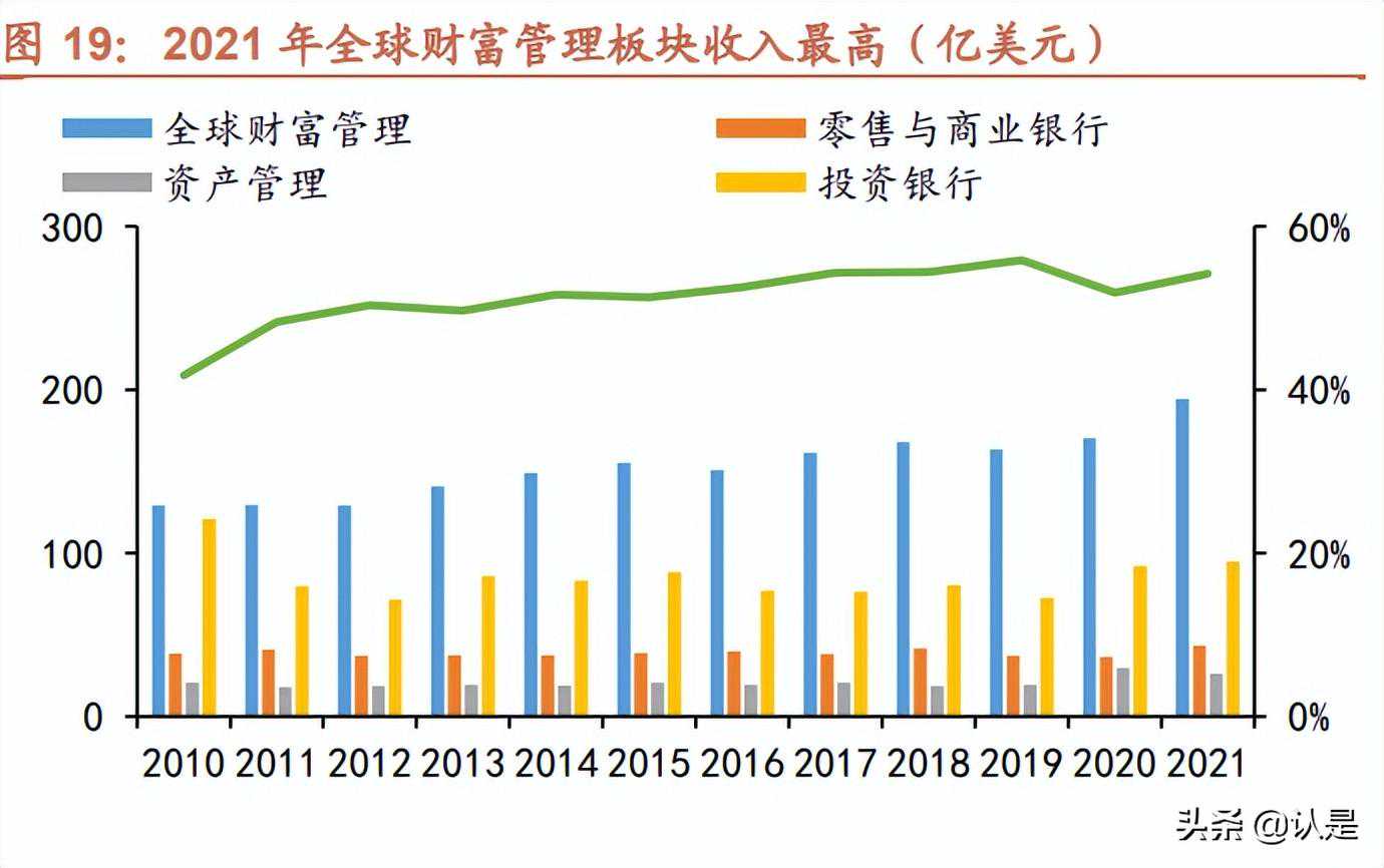 金融危机为分水岭,战略重心逐步转移。2000年,瑞银集团以120亿美元收购美国普惠公司(PaineWebber),该公司在资产管理和证券经纪领域尤有盛名。彼时,瑞银集团重点发力投行业务,投行业务营收占集团总营收的比例最高。2008年金融危机席卷全球,瑞银集团投行业务严重亏损,亏损金额高达276亿瑞士法郎,给集团造成重大损失。瑞银集团开始重新审视其核心业务,将业务发展重心逐步转移到财富管理部门。2011年,瑞银集团确立了“以财富管理为核心,资产管理与投行为辅助”的发展战略,并延用至今。经过近160年的锤炼,瑞银集团成功实现了以财富管理为核心的轻资产运行模式。