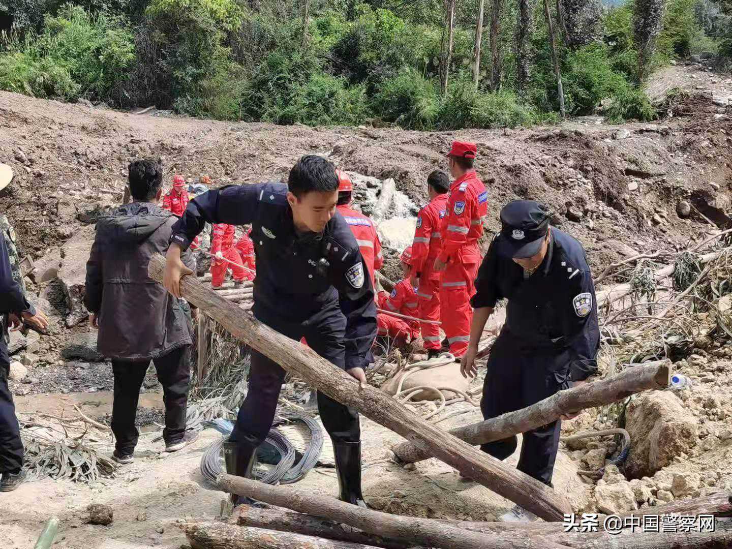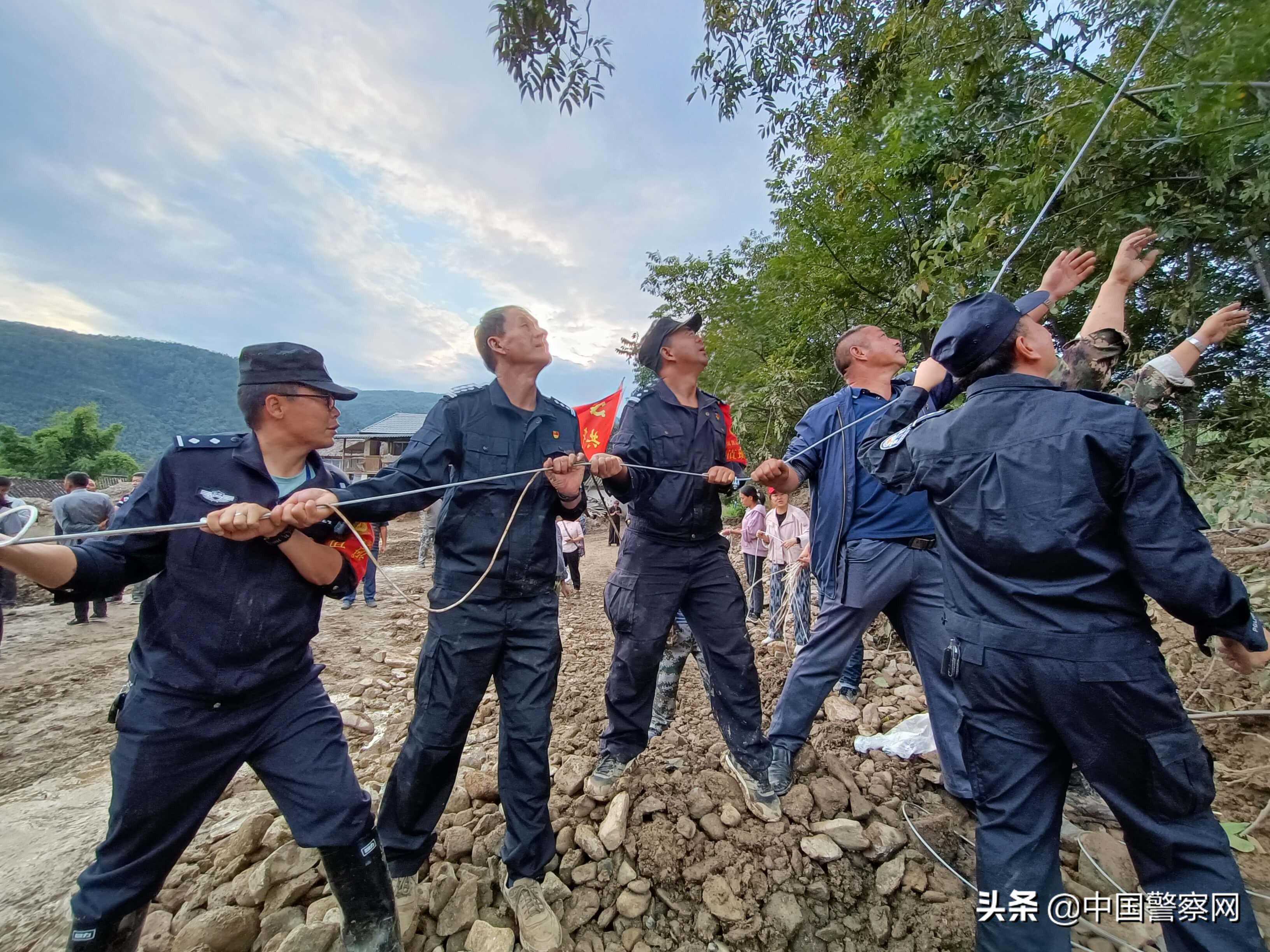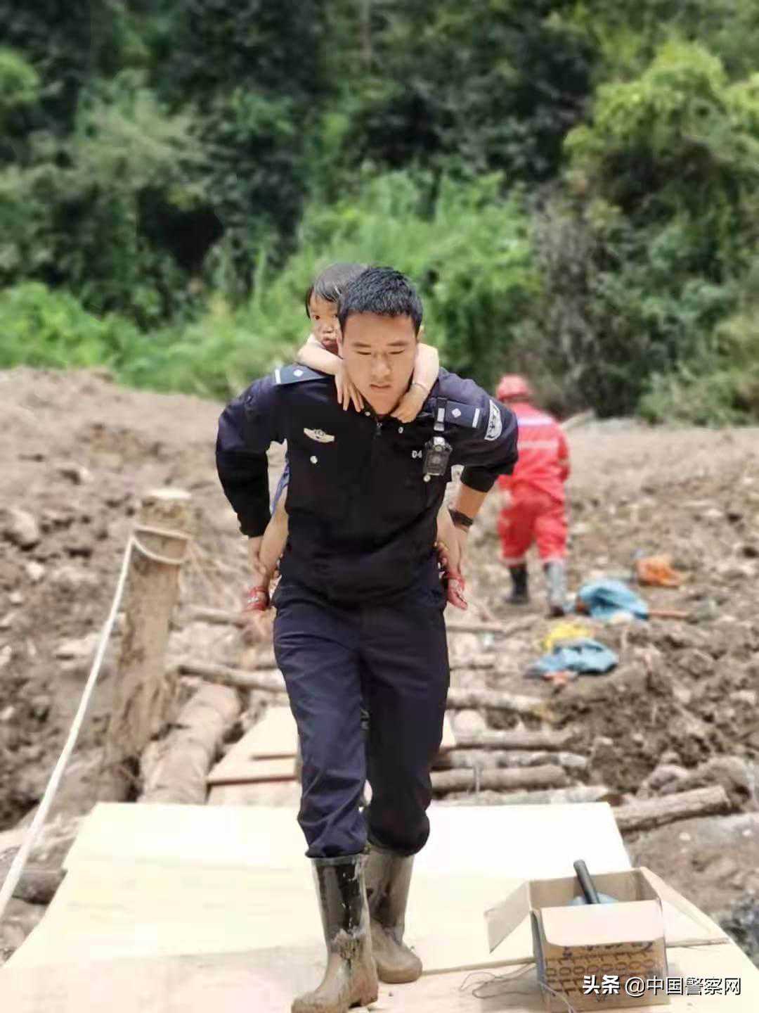 洱源县公安局副政委杨汝刚带领民警在炼铁乡新庄村开展救灾工作,他告诉大家,“由于桥梁被冲毁,我们要临时搭建一座桥,救援力量才能进入,困难当前,党员民警先上,今天的任务就是要打通这个救援生命通道。”任务艰巨,但是大家都坚信,一定能圆满完成任务。14日开始,参加救援的民警日夜连着运转,全力参与打通救援通道。李哲伦是炼铁派出所最年轻的民警,当得知有群众被困,他踏着泥泞,背起村里年幼的小男孩迅速安全转移。李哲伦说,作为入党积极分子,和战友们并肩战斗的这几天,更加坚定了要做一名吃苦在前、冲锋在前、无私奉献的共产党员的初心。