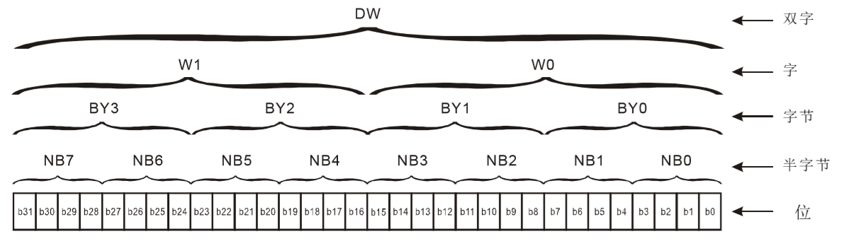 位,半字节,字节,字与双字之间的关系如下