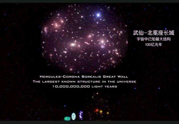 在上面所讲的大环和巨弧之外,还有斯隆长城和武仙-北冕座长城等。前者的长度可达13.7亿光年,而后者的长度则突破了100亿光年。