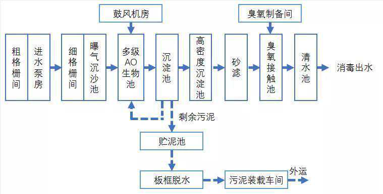预处理+分段进水多级A2O+二沉+高效沉淀池+过滤+(臭氧)+消毒
