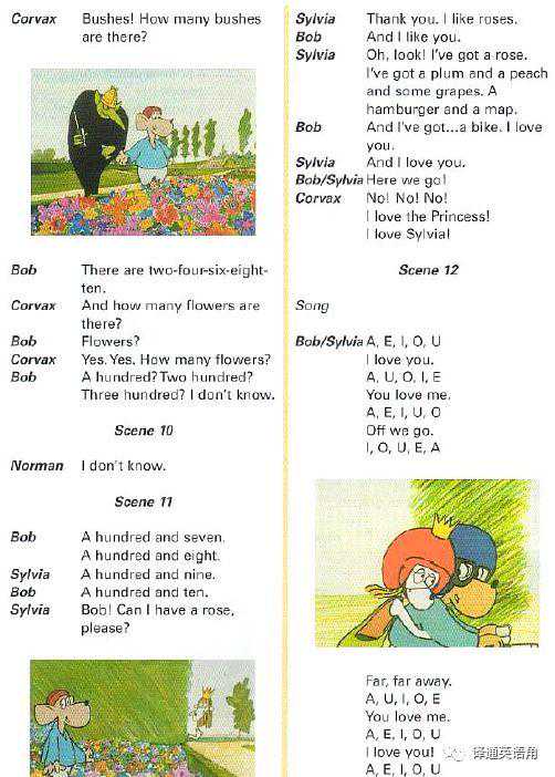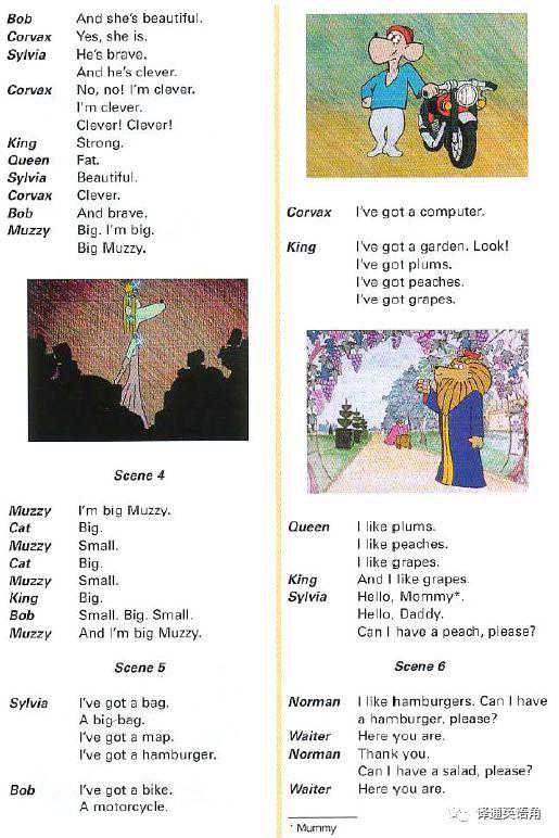 胖胖的王后推着手推车跟在后面,一边拼命摘水果,一边说,Ilikeplums(peaches、grapes).
