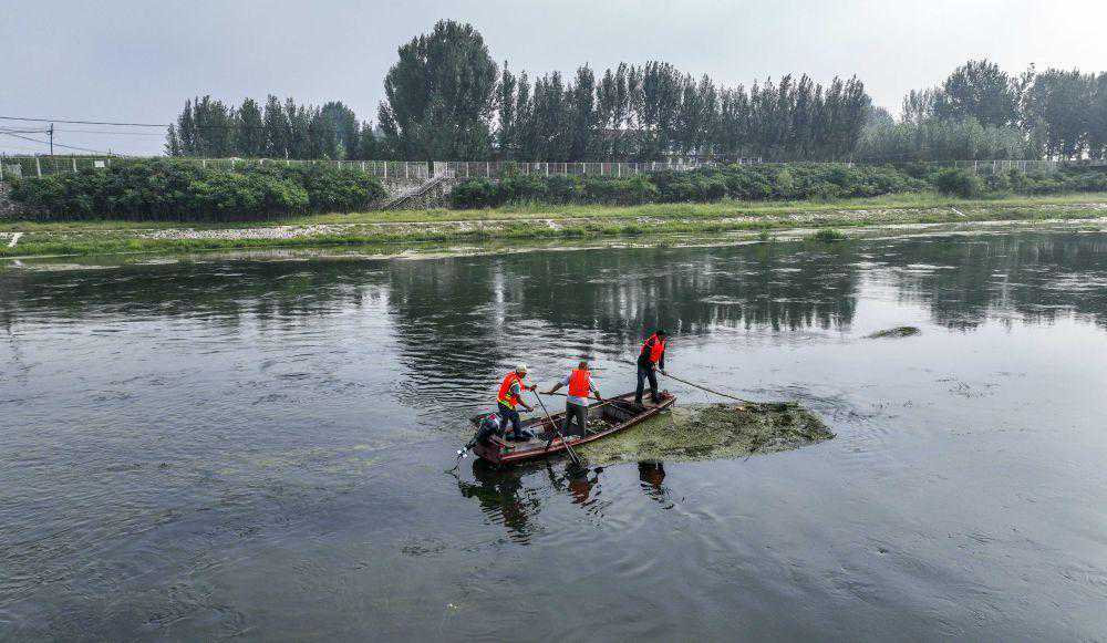 工作人员在引滦入津工程重要输水河道河北省遵化市黎河打捞漂浮物(2023年9月11日摄,无人机照片)。新华社发(刘满仓摄)