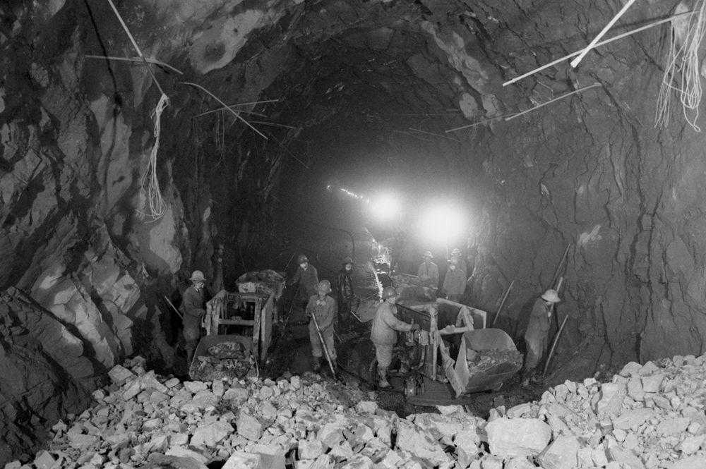 1982年,铁道兵第八师指战员在引滦入津工程隧道施工中人工装运石渣。新华社发