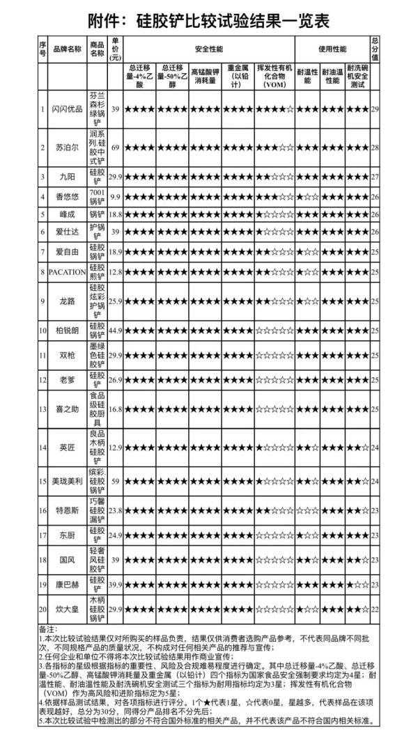 3月16日,江西省消保委发布硅胶铲比较试验结果。记者发现,尽管全部20款样品的化学性能均符合国家食品安全强制性标准要求,但所有样品的挥发性有机化合物指标均未能达到“更严要求”,特别是使用性能差异较大,部分样品在“耐温性能测试”“耐洗碗机安全测试”中表现不佳。