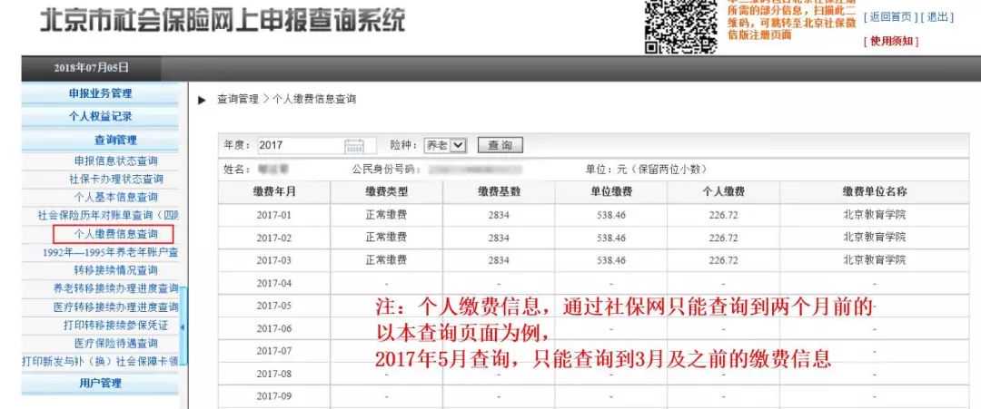 北京社保网上服务平台可以查询两个月及以前的缴费信息