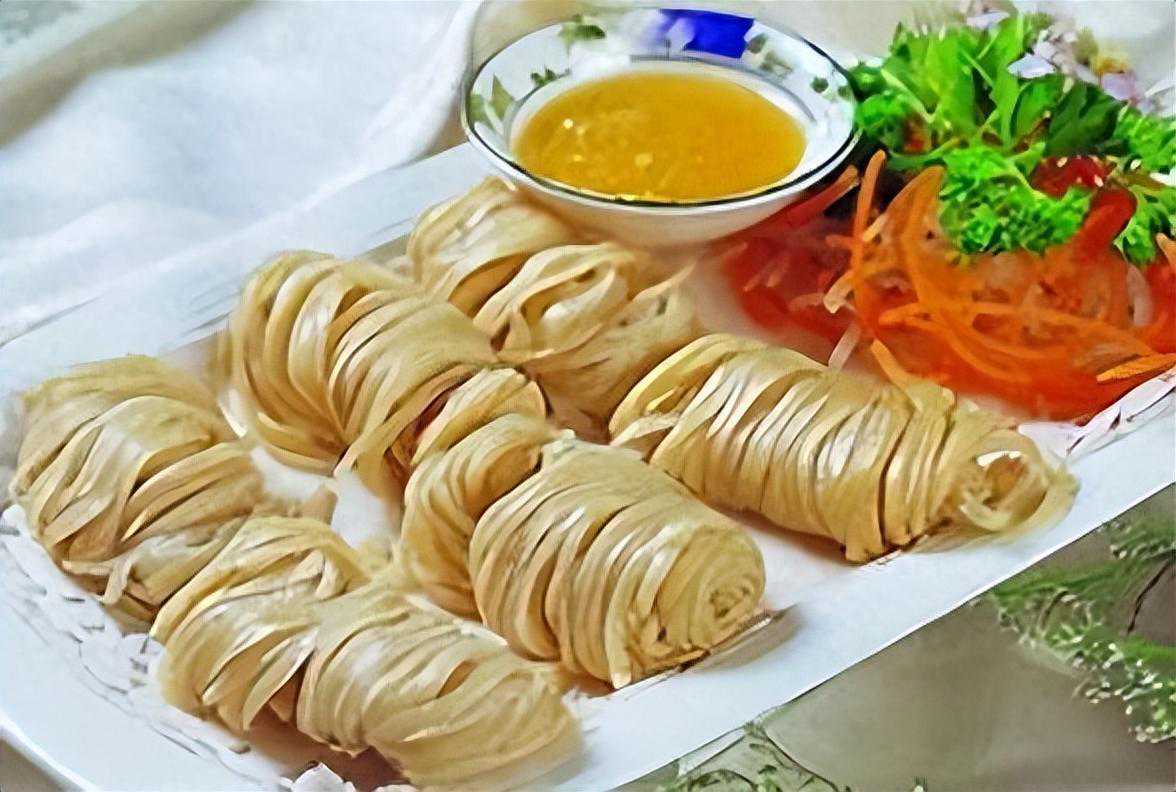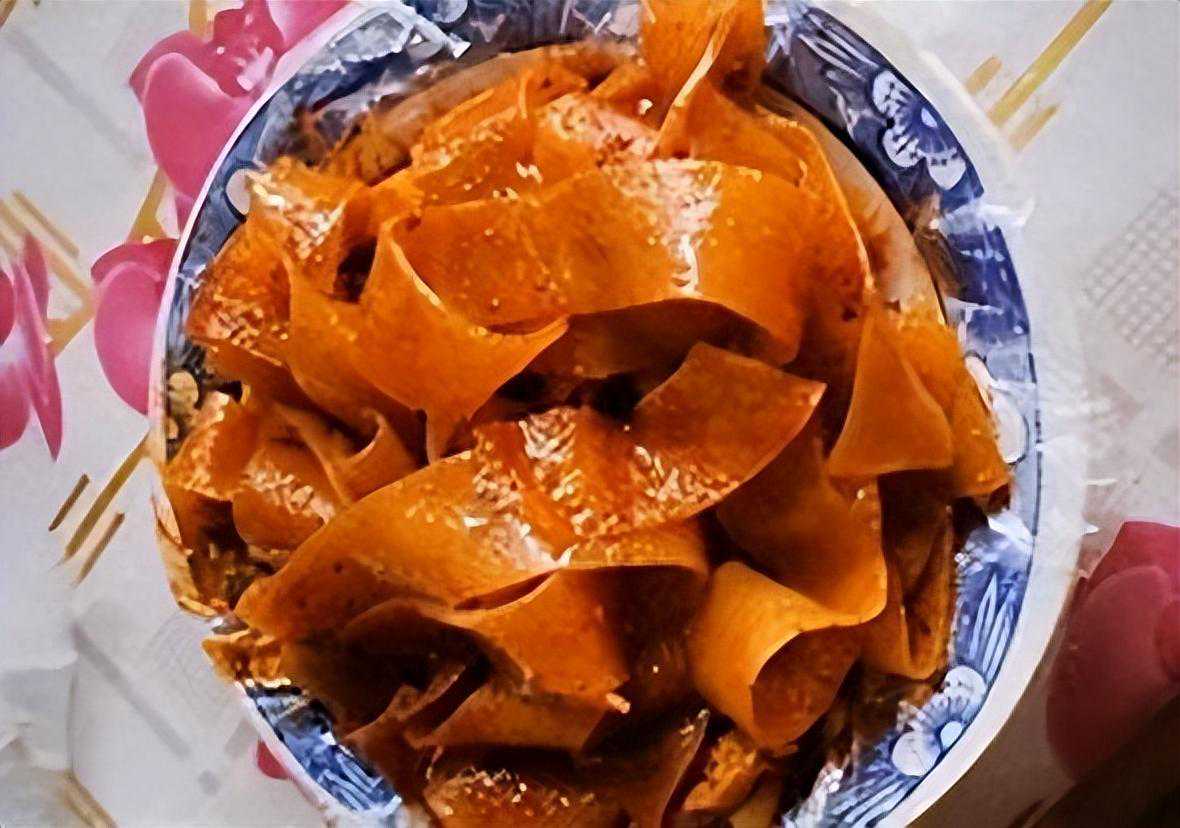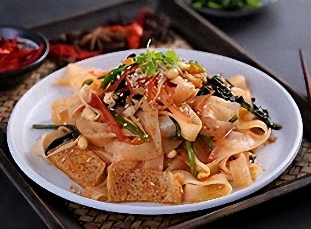 岐山擀面皮:一种用手工擀制的厚实面皮,凉拌或热食,加上酱油、醋、辣椒等佐料的小吃,是陕西关中民间传统风味面食之一,尤以宝鸡的岐山擀面皮最为正宗,以“白、薄、光、软、筋、香”而闻名。