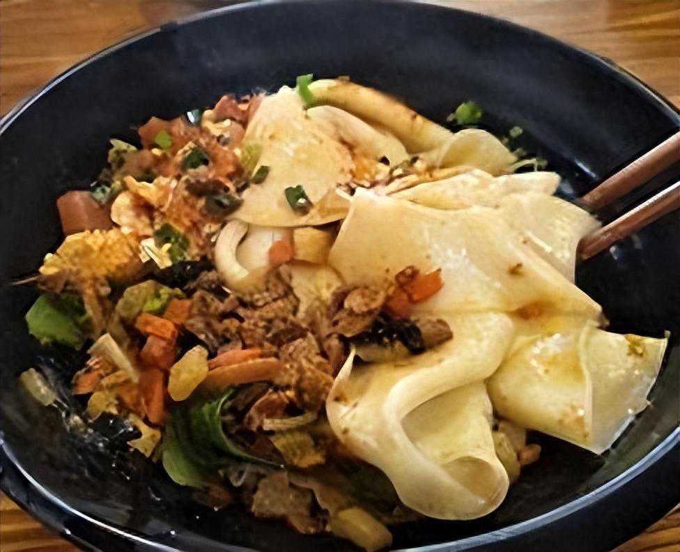 biangbiang面:一种用手工拉制的宽厚面条,加上油泼辣子和佐料的小吃,是陕西关中民间传统风味面食之一,因制作过程中会发出biáng的声音而得名,是关中八大怪之一,也是陕西著名的特色面食小吃。
