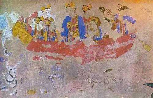 撒马尔罕阿夫拉西阿卜Afrasiab23号遗址大使厅壁画,武则天乘凤舟图