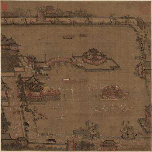 随着“龙”之形象逐渐为皇权所独享,龙舟遂成为皇家威仪的象征物。如汉刘向《淮南子》中云:“龙舟鹢首,浮吹以娱”,意为在龙身、鸟首的大船上,奏乐吹竽以娱乐;东汉班固《西都赋》亦述:“后宫乘輚辂,登龙舟”,这两则史料均指向汉王室乘龙舟游玩的史实。而历史上最为著名的皇家出游龙舟,当属随大运河南下的隋炀帝的“水殿龙舟”。