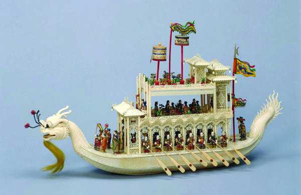 故宫博物院藏有的一艘清代象牙镂雕群仙祝寿图龙船,融合了民间龙舟的生动活泼与宫廷龙船富丽堂皇,形制上巧妙地“因料施艺,随形置景”,利用象牙的半弧外形,集雕、刻、镂、凿、透花、拼装等技巧于一景。龙舟酷似一条巨龙,通体鳞片纹,龙眼宝石镶嵌,龙须飘逸生风。船身镂置亭台楼阁,高低错落,参差有序。宫宇飞檐,斗拱累叠,花窗雕栏,旗幡飘扬。船舷与舱内人物百戏,或划桨竞棹,或舒袖广舞,或手摇羽扇,或扮仙练武,一派繁荣盛景之下寄寓着“风调雨顺,国泰民安”的端午祈祝。