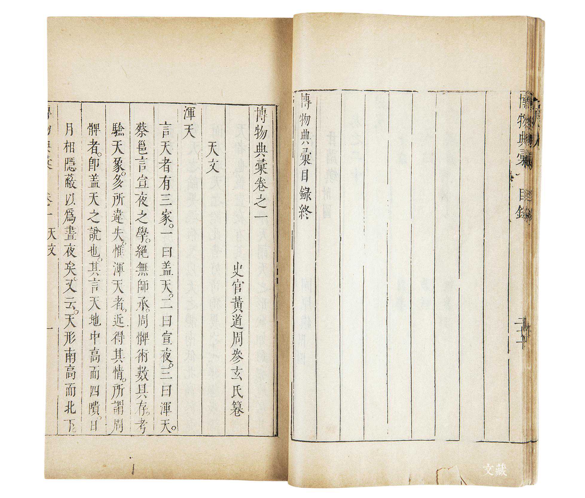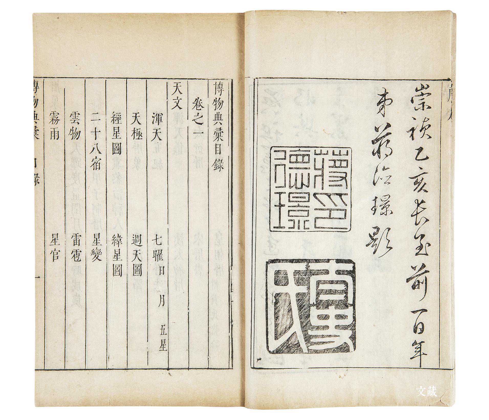 《博物典汇》,二十卷,十二册,眀崇祯八年刻本。版框纵二十点三厘米,横十四厘米,半页九行,行十九字,白口,左右双边。卷前有崇祯乙亥年蒋德璟序(序缺第一页)。卷端题「史官黄道周参玄氏纂」,共分七十一类,卷一为天文、历象,卷二为礼制、乐制、钟律,卷三为朝廷礼、群礼,卷四为郊祀、宗庙、群祀、释奠,卷五为物用、都邑、城阙、潮汐,卷六为王霸、文质、正朔、德运、灾祥、敬畏、戒欲、孝睦,卷七为后妃、储贰、戚畹、宦官,卷八为正治、驭臣,卷九为建官、宰执、侍从,卷十为台谏、封建、藩省,卷十一为郡县、学校、选举,卷十二为铨选、考课、推举、谥法,卷十三为田制、水利、赋税、土贡、户口、役法、理财,卷十四为盐法、茶法、杂榷、荒政、市糴、钱币,卷十五为漕运、河道、屯田,卷十六位兵制、兵道、兵书、兵柄,卷十七为将帅、马政、教兵、阵法,卷十八为刑制、遏盗、驭戎,卷十九为九边,卷二十为四夷。