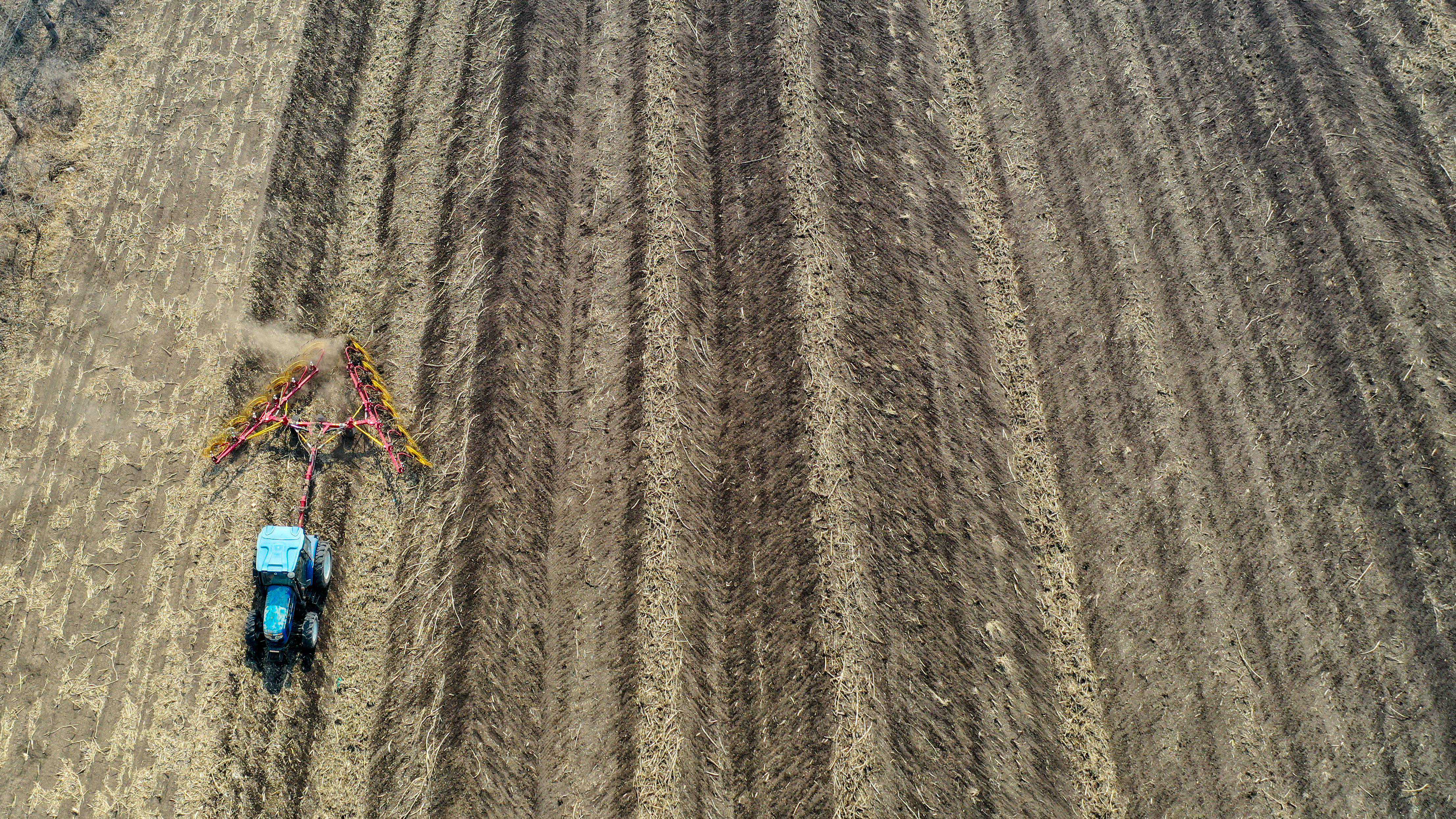 4月2日,在吉林省公主岭市范家屯镇乾程农民专业合作社,农民驾驶农机整理耕地上的秸秆(无人机拍摄)。新华社记者张楠摄