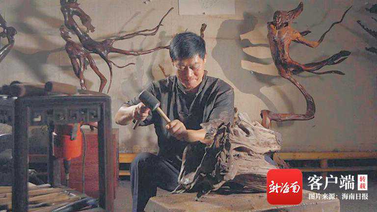 海南黄花梨根雕匠人梁镇师是海南万宁人,在《匠韵琼艺》中,梁镇师介绍自己玩根雕30多年了,根雕的魅力在于可以“化腐朽为神奇”。