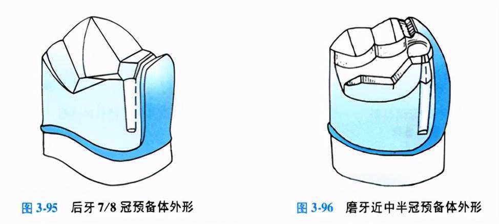 3.后牙7/8冠的牙体预备(图3-95)后牙7/8冠是3/4冠的变异设计,当后牙(尤其上颌磨牙)的远中颊尖需要被覆盖时,可做7/8冠。固位力优于3/4冠,远中轴沟移位于颊面,因视野相对清楚故其轴沟的预备较3/4冠容易。