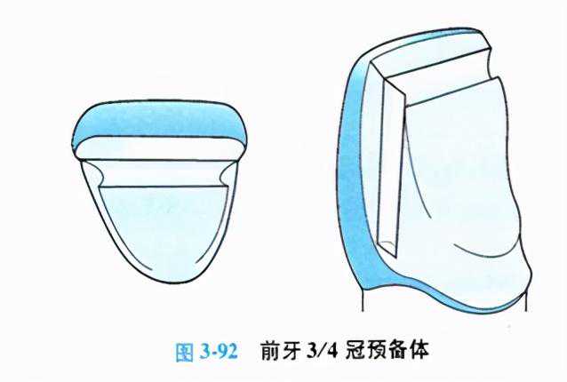 1.前牙3/4冠的牙体预备(图3-92)前牙如果有金属边缘暴露则会严重影响美观,所以前牙3/4冠牙体预备时应以尽量避免暴露切缘与近远中的金属边缘为原则。牙体预备步骤如下: