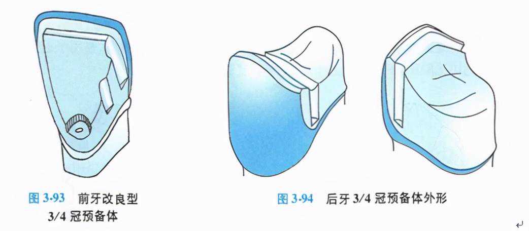 2.后牙3/4冠的牙体预备(图3-94)后牙3/4冠尤其是上颌后牙应用3/4冠修复效果最好,既能良好地修复缺损,恢复功能,固位形容易设计,又不影响美观、减少牙体预备量。