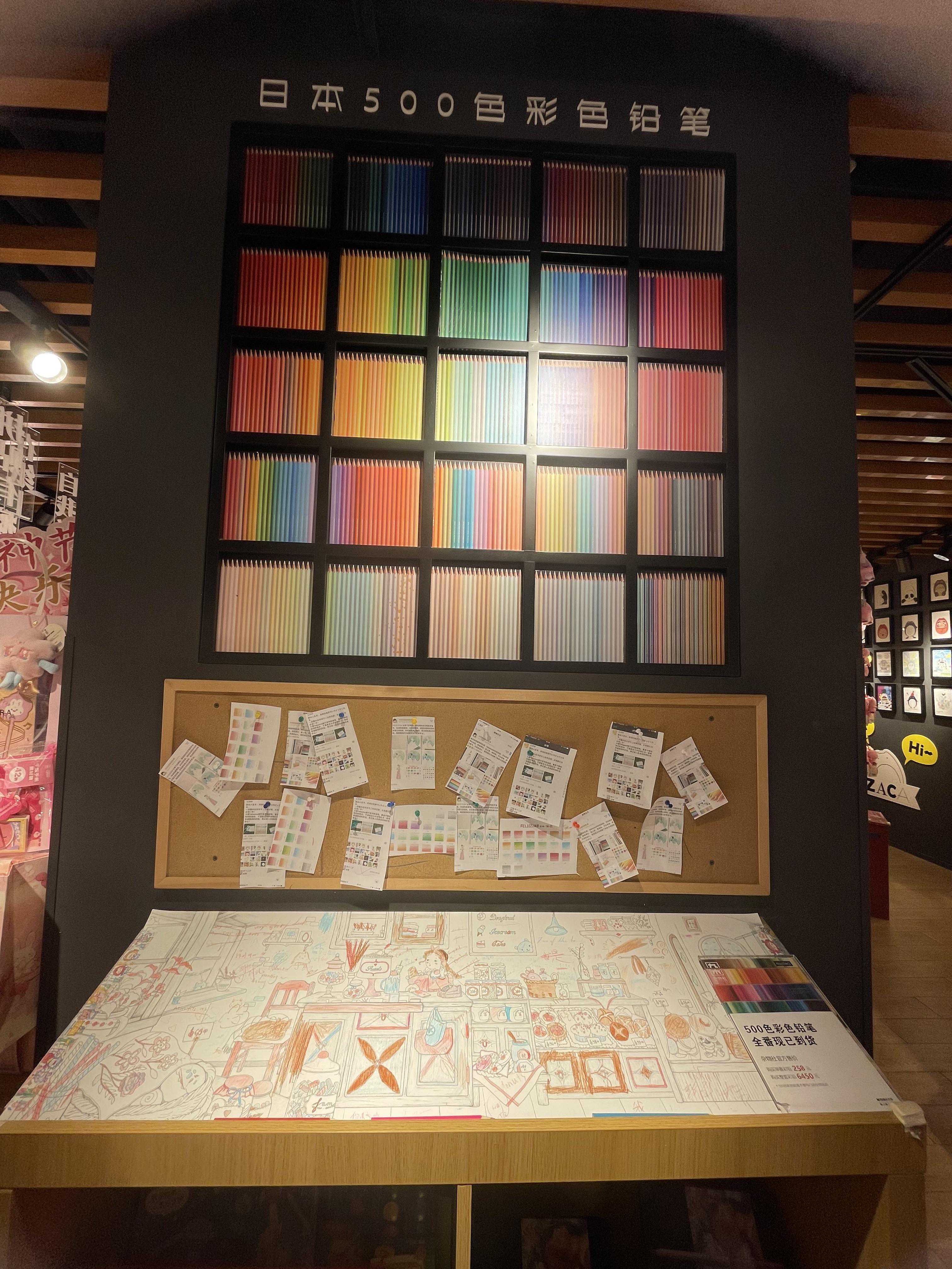 令人惊喜的是,这里有一整面彩色铅笔墙,500色彩色铅笔,放眼望去,就像一个色彩缤纷的世界,桌上是彩色铅笔画的手写卡和涂鸦。