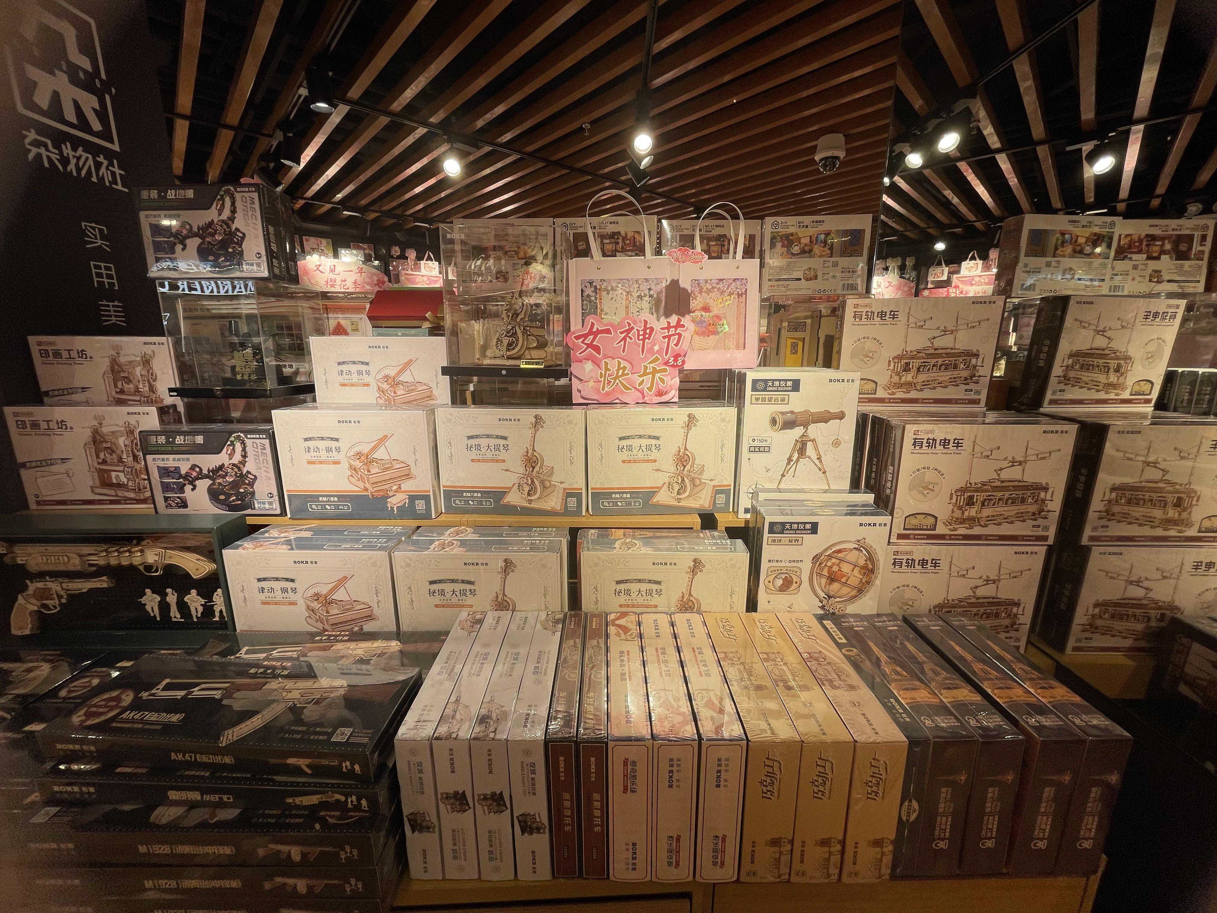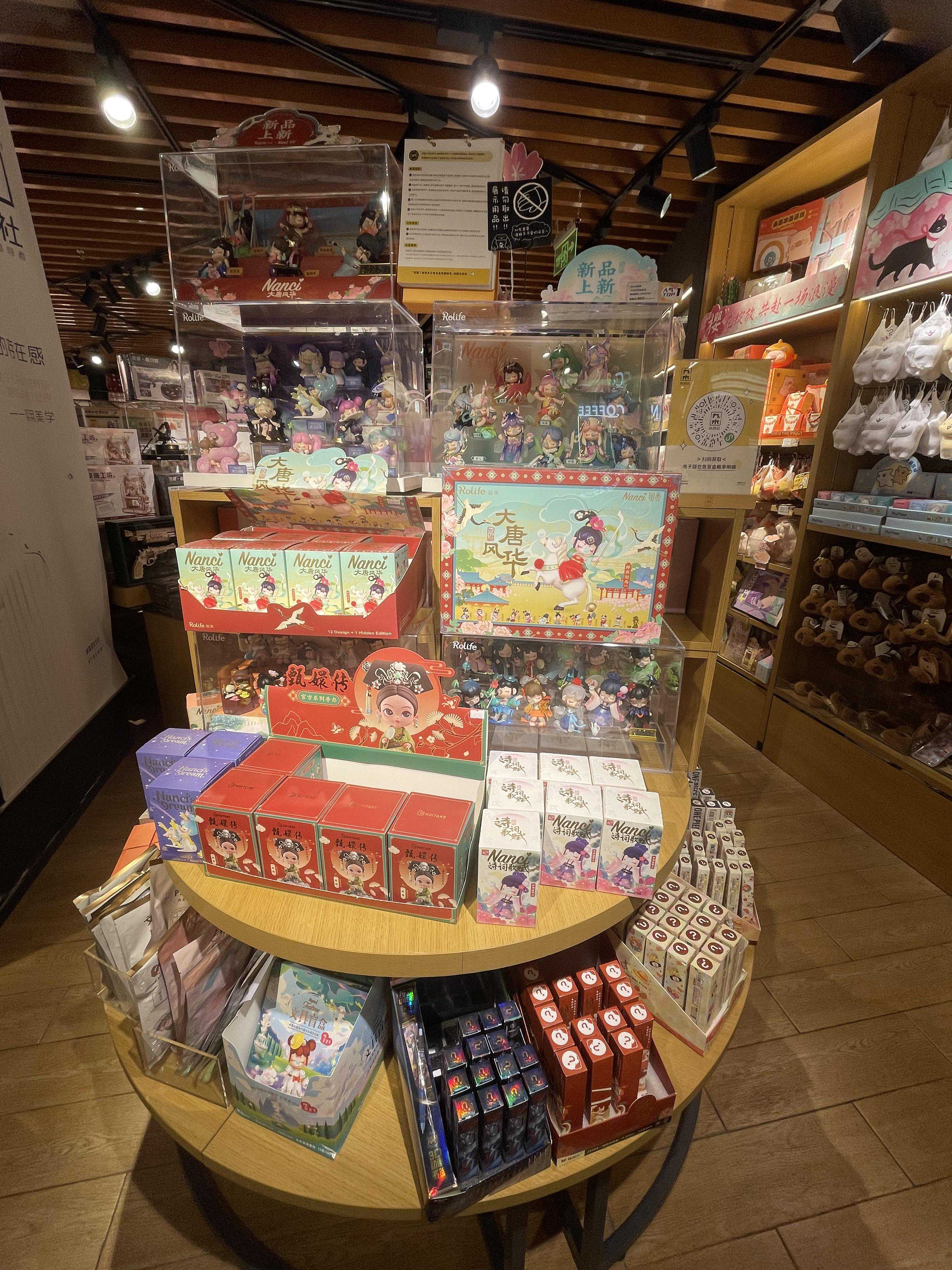 彩铅墙的旁边是盲盒,有热销的甄嬛传系列、大唐风华系列等。木质的乐器、地球仪、有轨电车等洋溢着满满的文艺范儿。