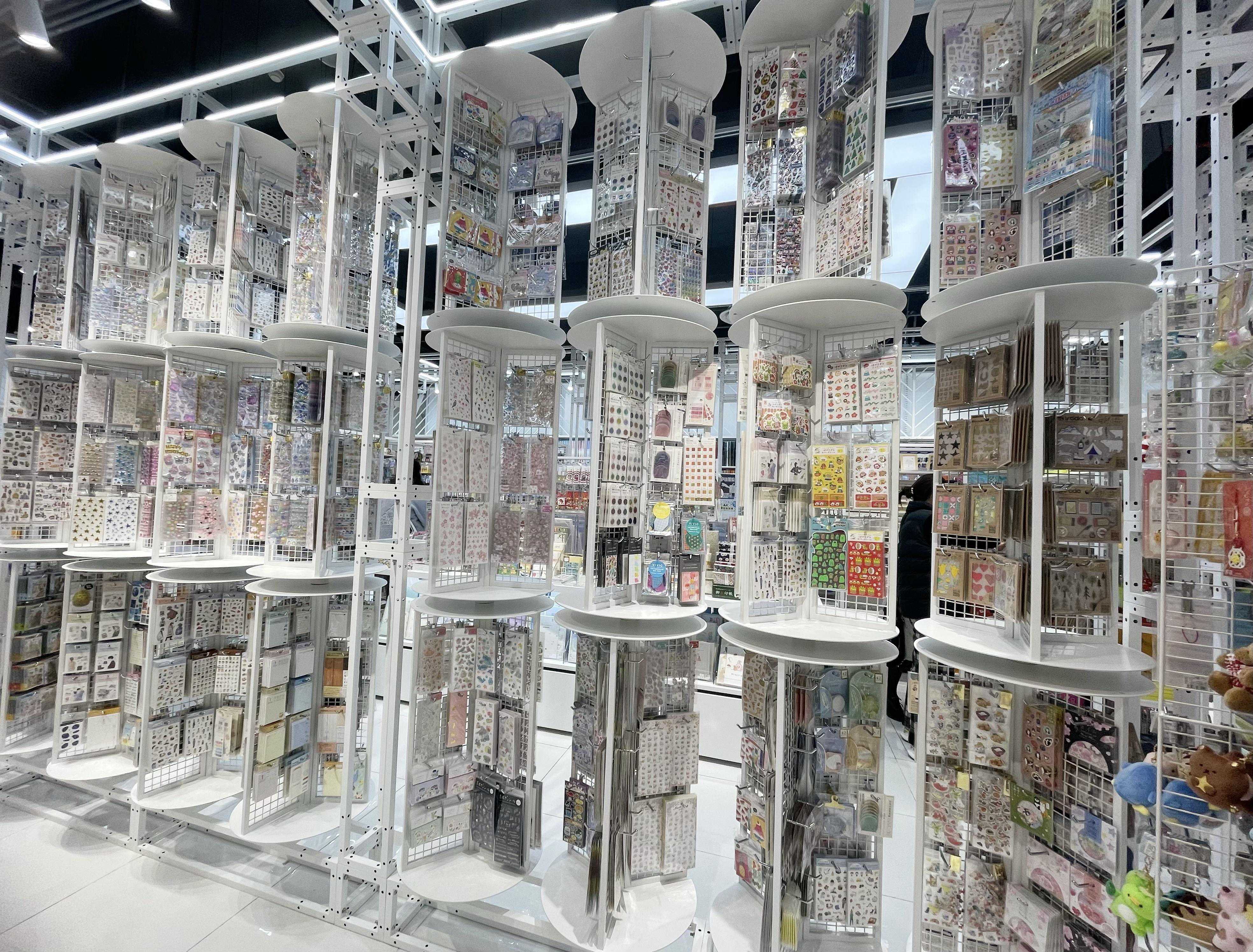 除了书写工具,最令人惊喜的是一整排转筒墙,上面是一张张精美的贴纸,充满创意又趣味十足。
