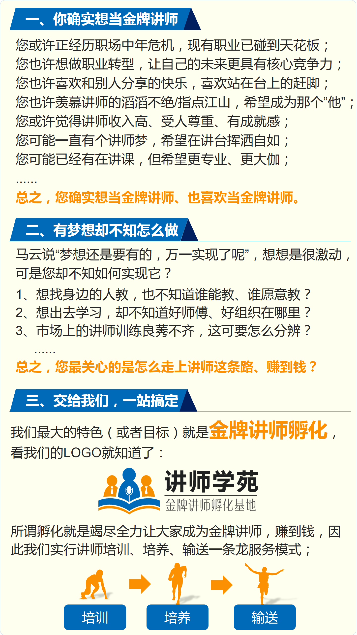 本次主办单位——讲师学苑:专注讲师培训、培养与输送一条龙服务。提供专业系统的培训、魔课、练习、践习、商讲,如国家版权课程《培训师九段》、《NPTT九段职业讲师魔训营》等。