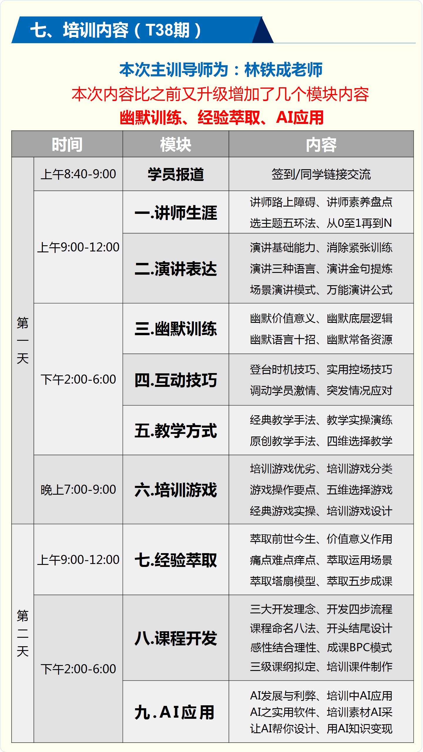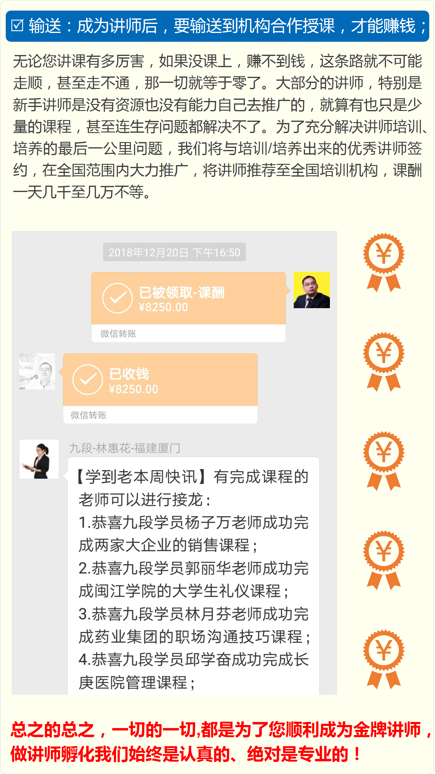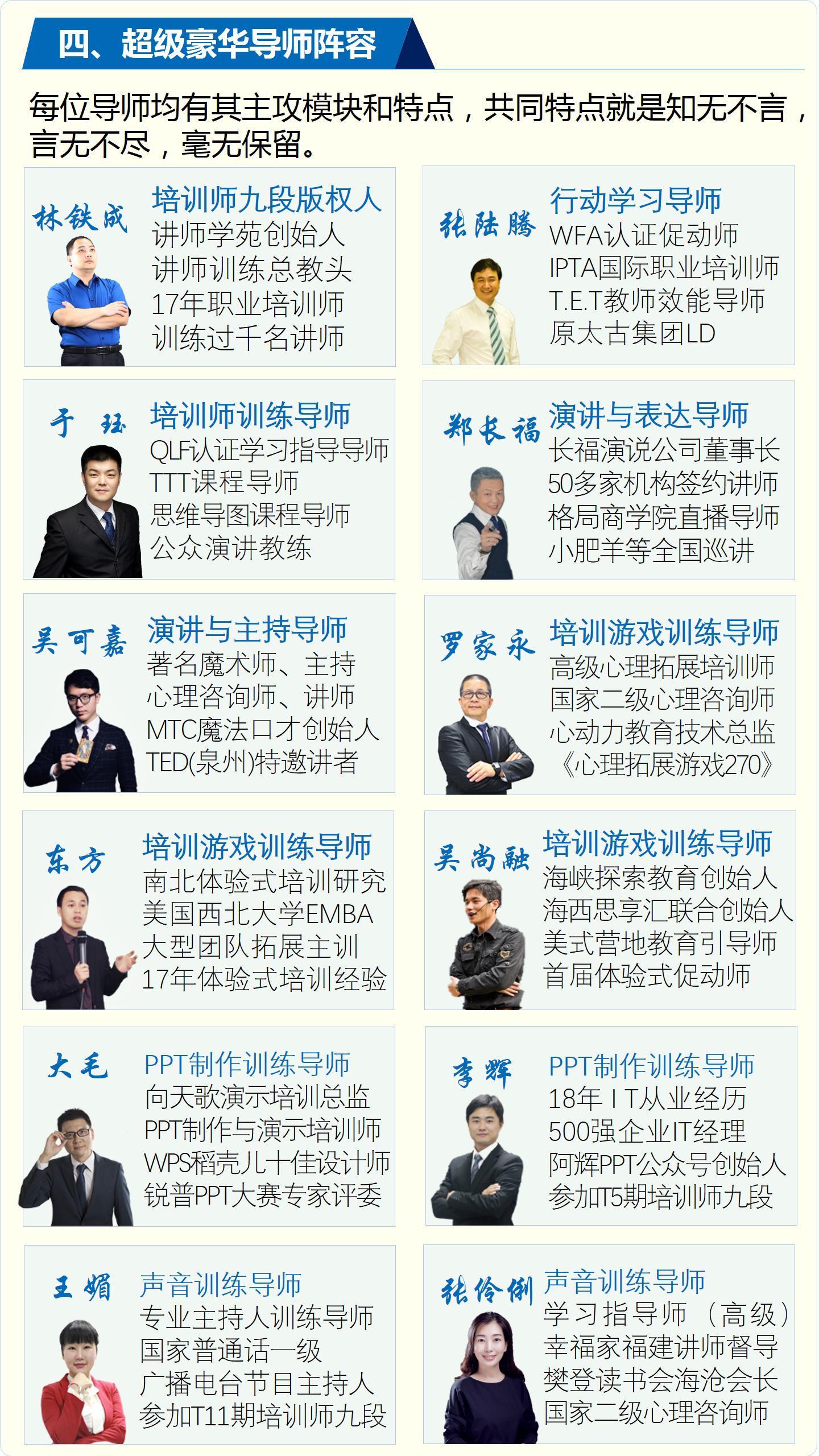 本次联办单位——训大教育:专注讲师培训、培养与输送一条龙服务。提供专业系统的培训、魔课、练习、践习、商讲,如国家版权课程《培训师九段》、《NPTT九段职业讲师魔训营》等。
