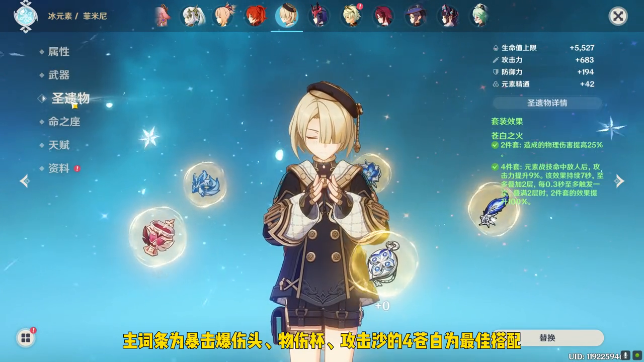 因此,圣遗物方面,主词条应为暴击、爆伤头、物伤杯、攻击沙。最佳搭配是四苍白。