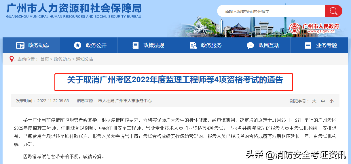 鉴于广州当前疫情防控形势严峻复杂,经审慎研判,决定取消原定于11月26日、27日举行的广州考区2022年度监理工程师、注册城乡规划师、中级注册安全工程师、出版专业技术人员职业资格等4项考试。