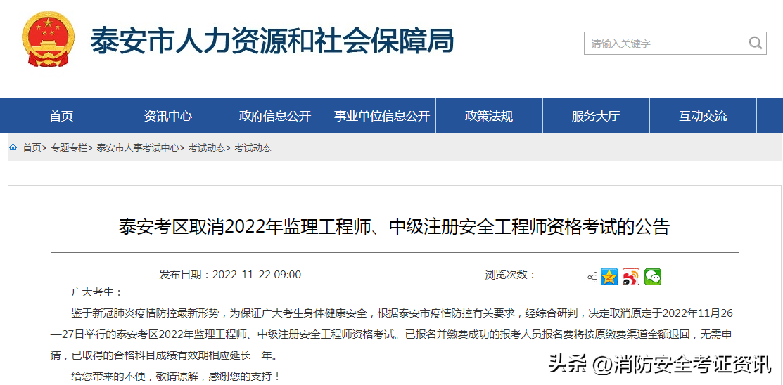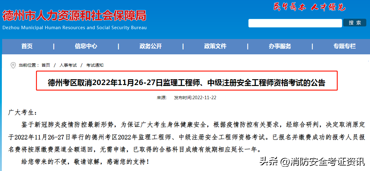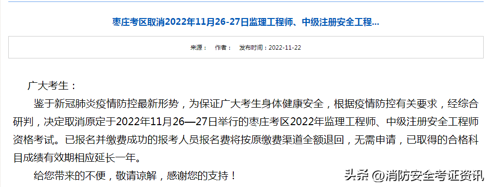 鉴于枣庄、德州、泰安市新冠肺炎疫情防控最新形势,经综合研判,决定取消原定于2022年11月26-27日举行的枣庄考区2022年监理工程师、中级注册安全工程师资格考试。已报名并缴费成功的报考人员报名费将按原缴费渠道全额退回,无需申请,已取得的合格科目成绩有效期相应延长一年。