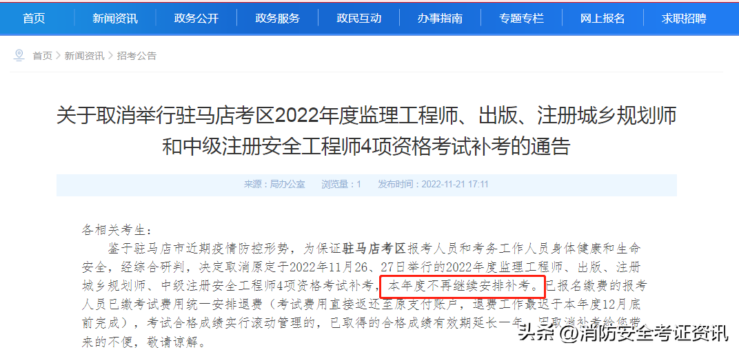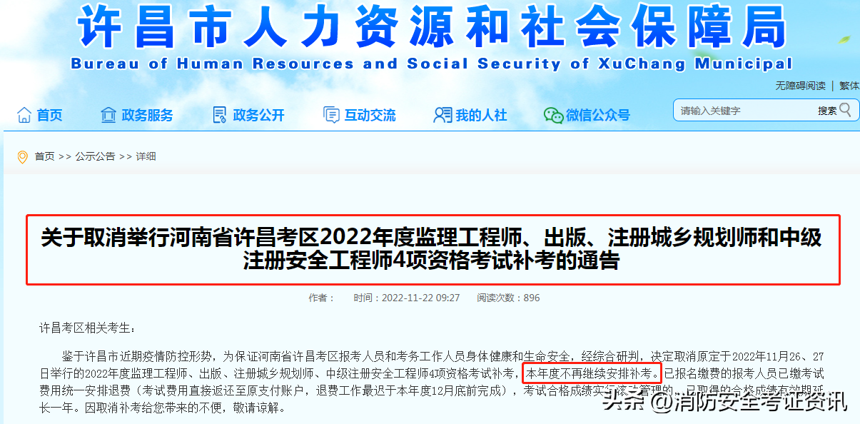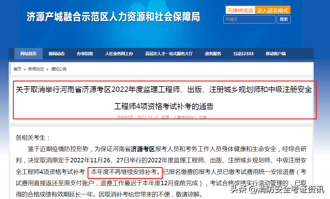 鉴于焦作、驻马店、济源、许昌、安阳市近期疫情防控形势,经综合研判,决定取消原定于2022年11月26、27日举行的2022年度监理工程师、出版、注册城乡规划师、中级注册安全工程师4项资格考试补考,本年度不再继续安排补考。