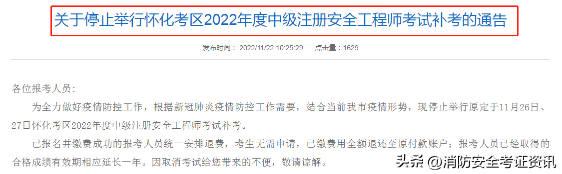 根据新冠肺炎疫情防控工作需要,结合当前我市疫情形势,现停止举行原定于11月26日、27日怀化考区2022年度中级注册安全工程师考试补考。